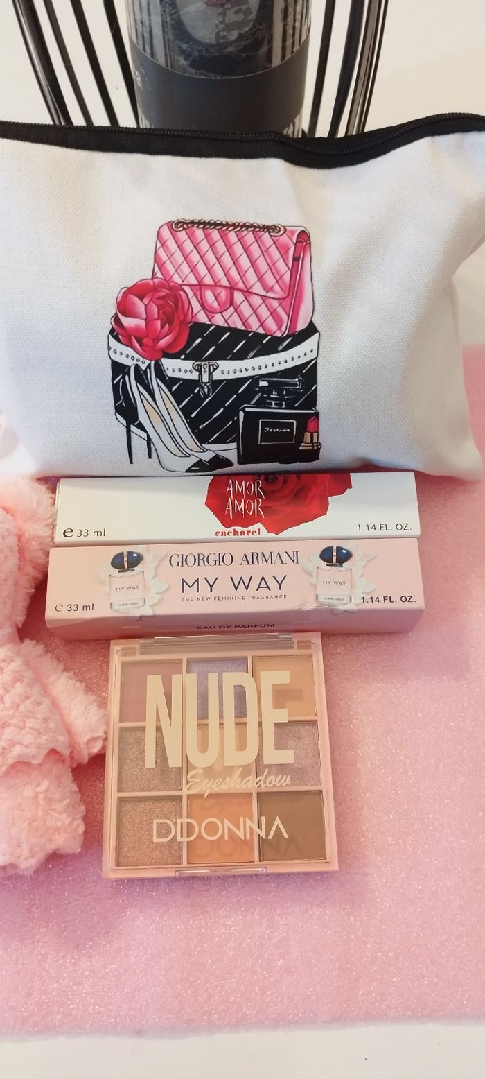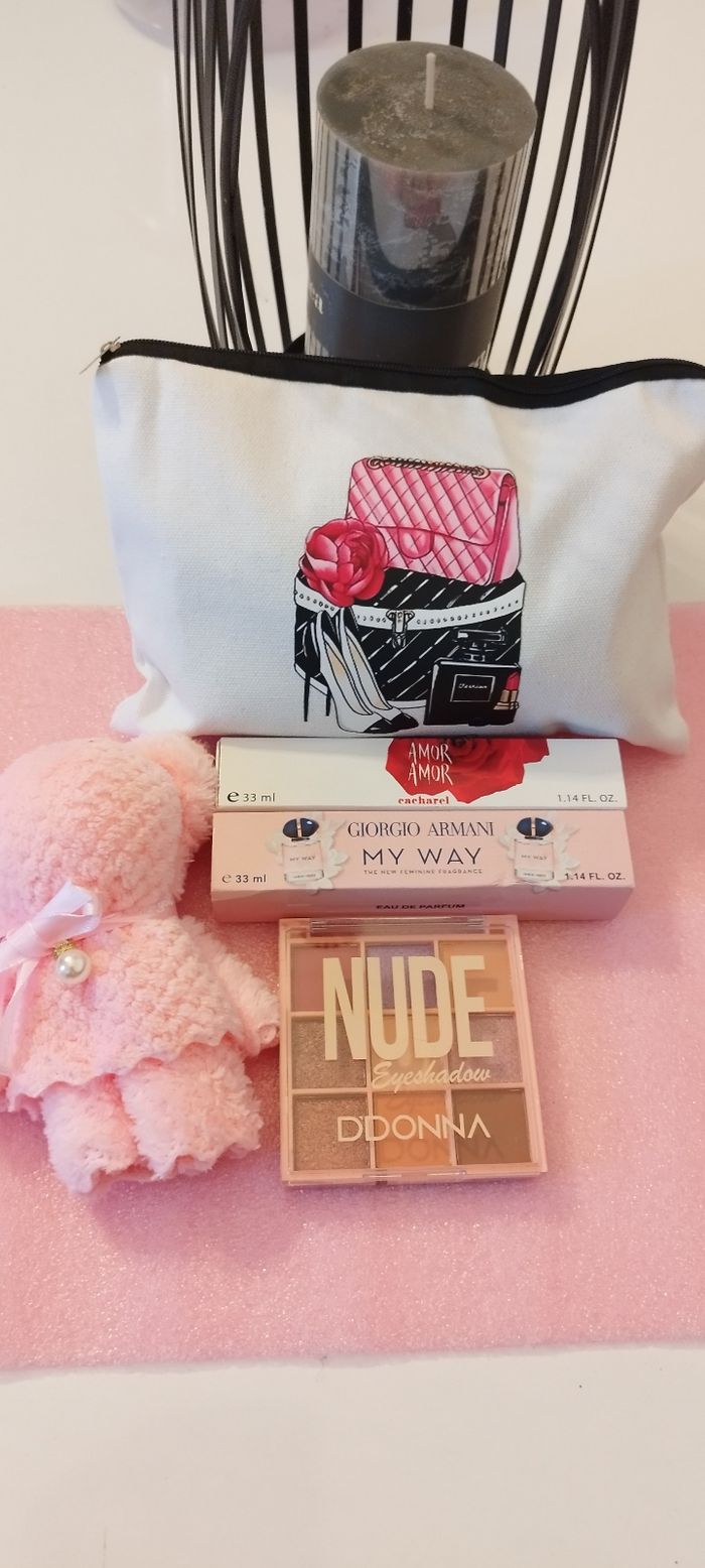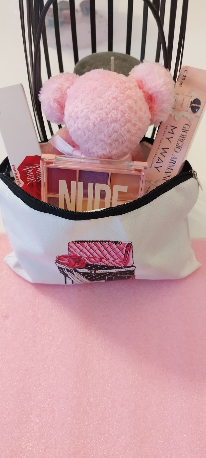 Trousse maquillage garnie 2 parfums de poche 1 ourson serviette 1 palette fards à paupières