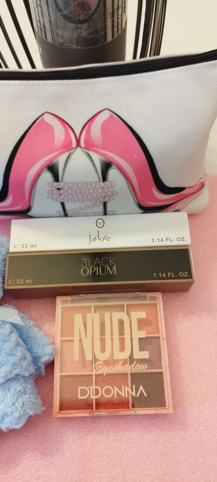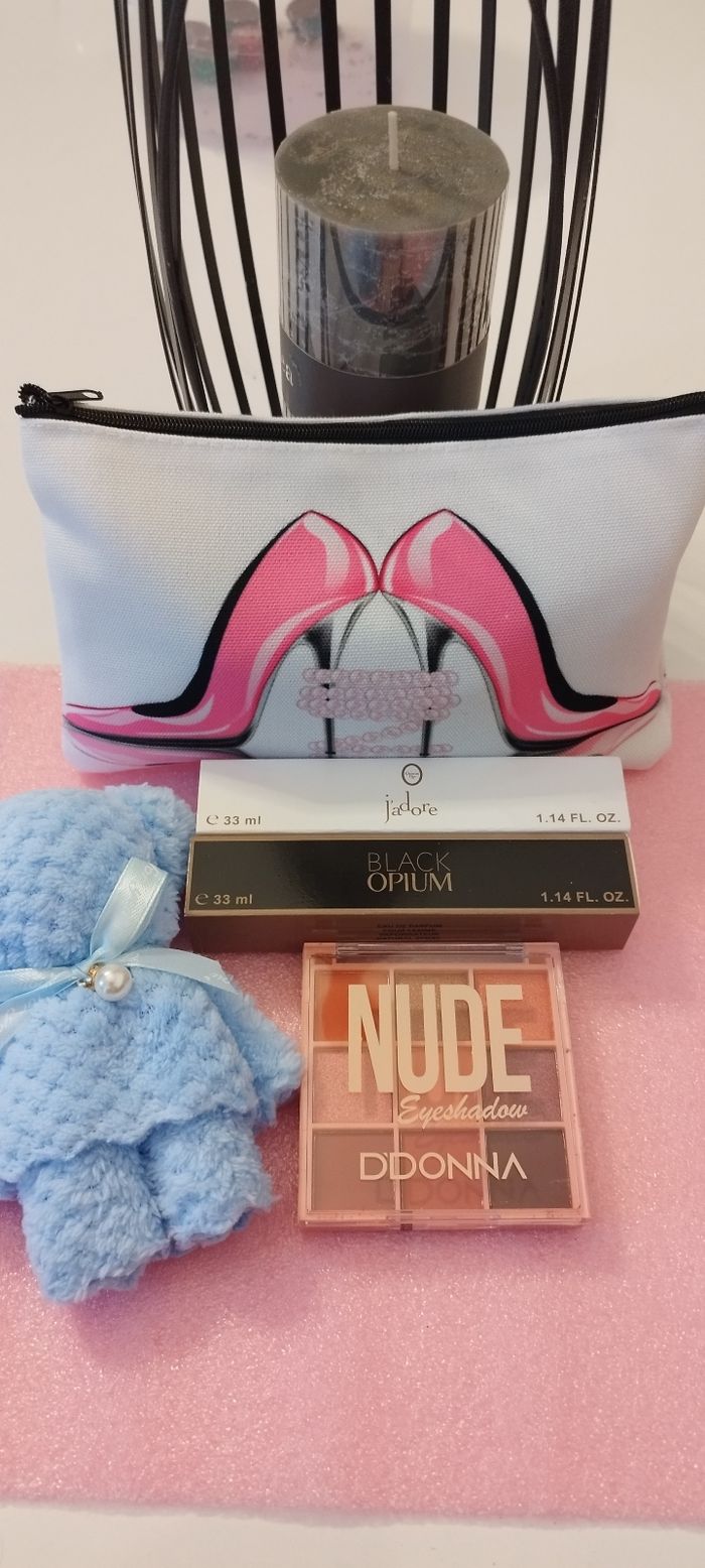 Trousse à maquillage garnie 2 parfums de poche 1 ourson serviette 1 palette fards à paupières