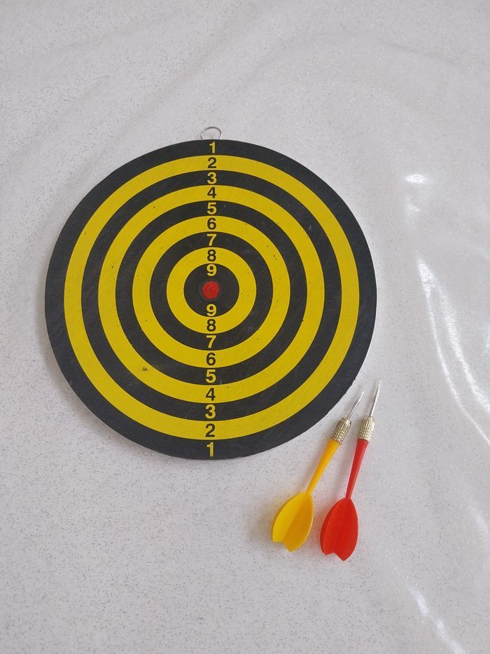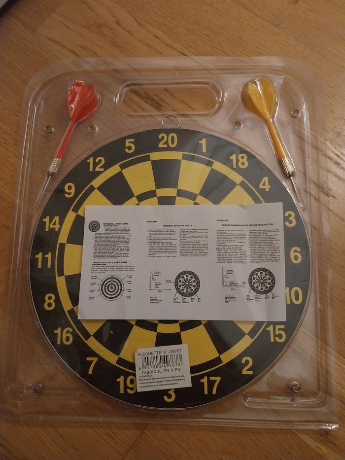 Jeu de fléchettes pour enfant, une cible avec accroche et 2 fléchettes, neuf jamais utilisé. Vendu dans son emballage d'origine avec fiche des règles du jeu et conseils d'installation (en français).