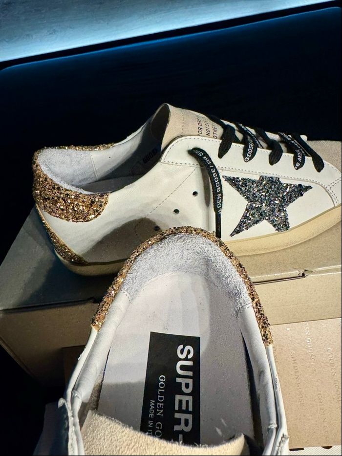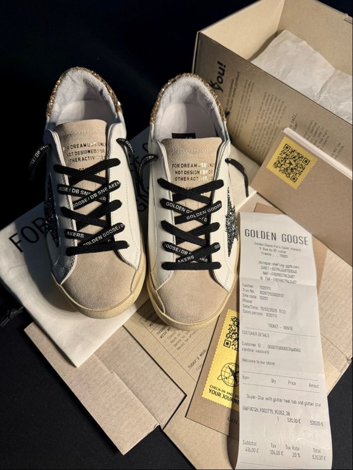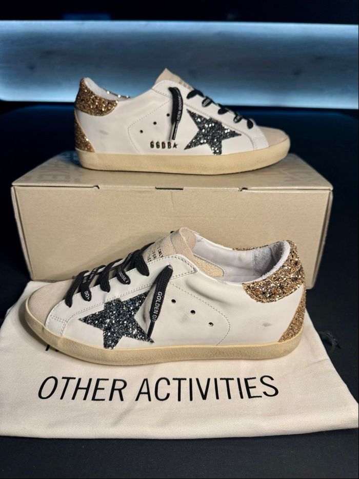 Je vends cette superbe paire de Golden Goose Superstar en taille 37 ✨ ✔️ État : Neuves (jamais portées) ✔️ Boîte d’origine incluse ✔️ Lacets Golden Goose ✔️ Étoile pailletée noire ✔️ Talon pailleté doré ✔️ Effet vintage volontaire signature de la marque Modèle iconique, intemporel et très tendance. Parfaites pour compléter une tenue casual chic 👟 Aucun défaut, elles sont strictement neuves.