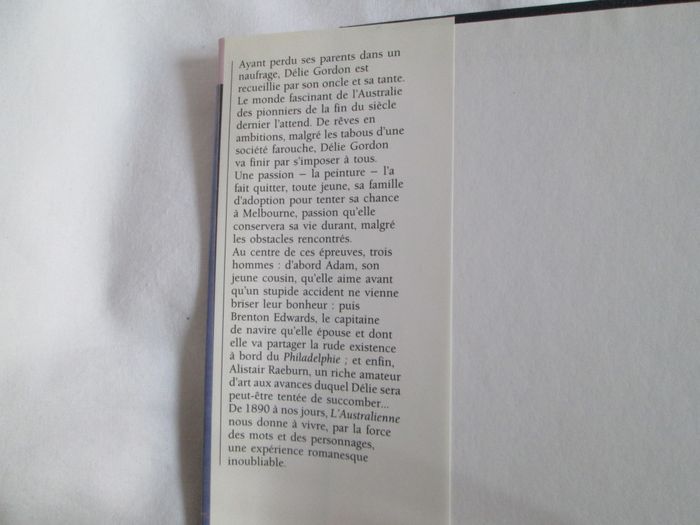 Vends livre L'Australienne de Nancy Cato. Comme neuf. "Ayant perdu ses parents dans un naufrage, Délie Gordon est recueillie par son oncle et sa tante. Le monde fascinant de l'Australie des pionniers de la fin du siècle dernier l'attend. De rêves en ambitions, malgré les tabous d'une société farouche, Délie Gordon va finir par s'imposer à tous. Une passion - la peinture - l'a fait quitter, toute jeune, sa famille d'adoption pour tenter sa chance à Melbourne, passion qu'elle conservera sa vie durant, malgré les obstacles rencontrés. Au contre de ces épreuves, trois hommes : d'abord Adam, son jeune cousin, qu'elle aime avant qu'un stupide accident ne vienne briser leur bonheur : puis Brenton Edwards, le capitaine de navire qu'elle épouse et dont elle va partager la rude existence à bord du Philadelphie ; et enfin, Alistair Raeburn, un riche armateur d'art aux avances duquel Delie sera peut-être tentée de succomber ... De 1890 à nos jours, L'Australienne nous donne à vivre, par la force des mots et des personnages, une expérience romanesque inoubliable." N'hésitez pas à consulter mes autres annonces.