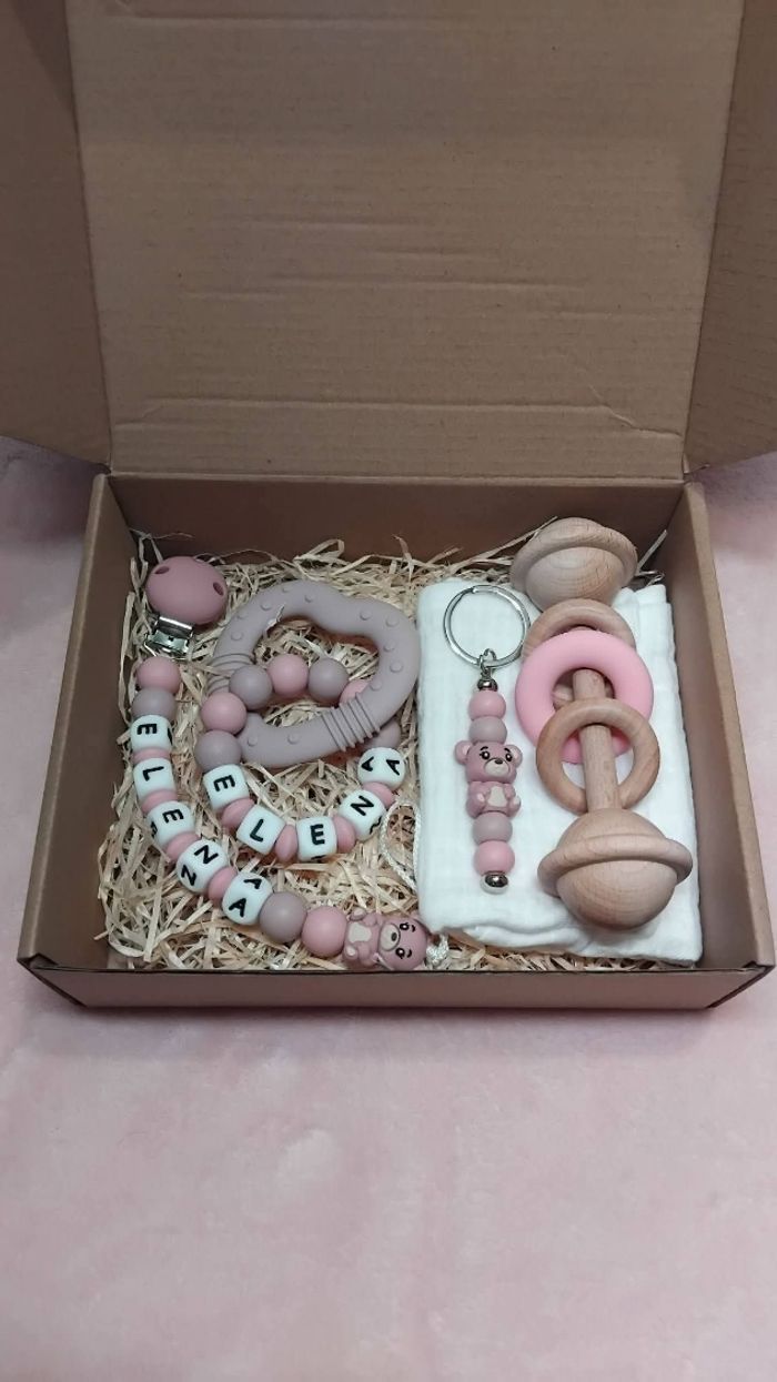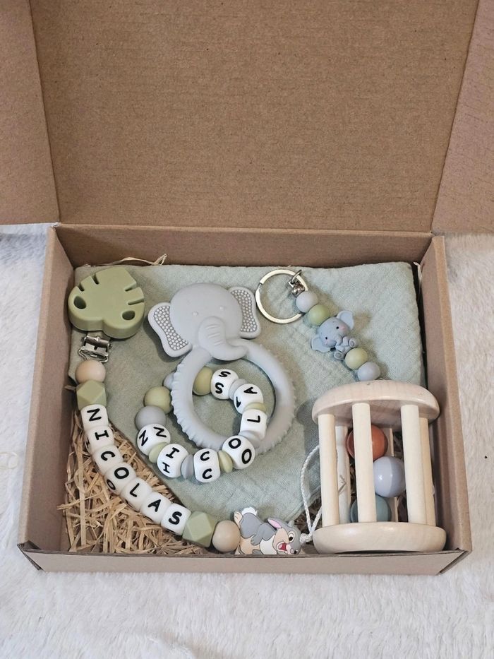 Coffret bébé ( prix peuvent varier en fonction des modèles et articles choisis) - attache tétine ( plusieurs modèles disponibles) - anneau de dentition ( plusieurs modèles disponibles) - porte clé assorti à l'attache tétine ( pour clé ou sac bébé ) - 1 serviette en gaze de coton ( d'autre couleur disponibles) - 1 jouet en en bois ( d'autre modèle disponible ) Possible de rajouter un bandeau avec noeud ( plusieurs disponible ) Attache doudou ( plusieurs modèles disponibles )