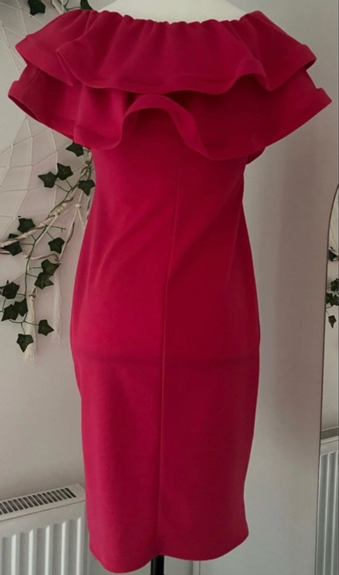 robe rose pour occasion ou autre, matière très agréable, près du corps, avec volume sur le haut de la robe, épaule dénudé.