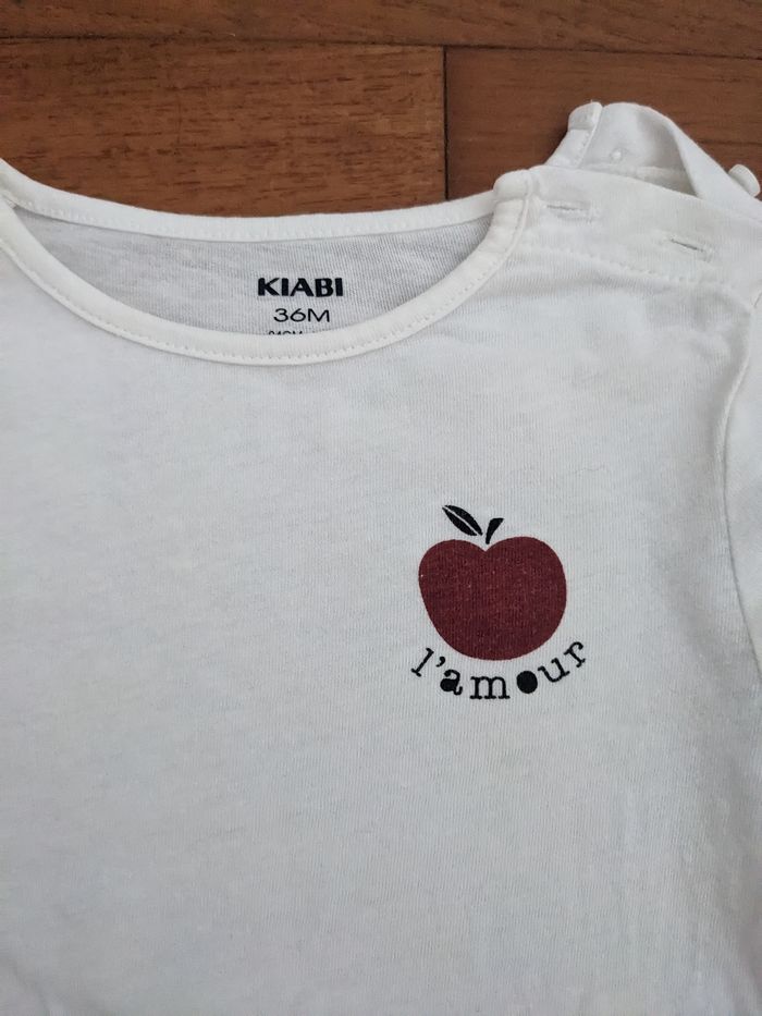 Peu porté Blanc avec motifs pommes (le motif est légèrement moins vif) Acheté neuf en magasin Coton bio 36 mois (mis jusqu a 4,5 ans env)