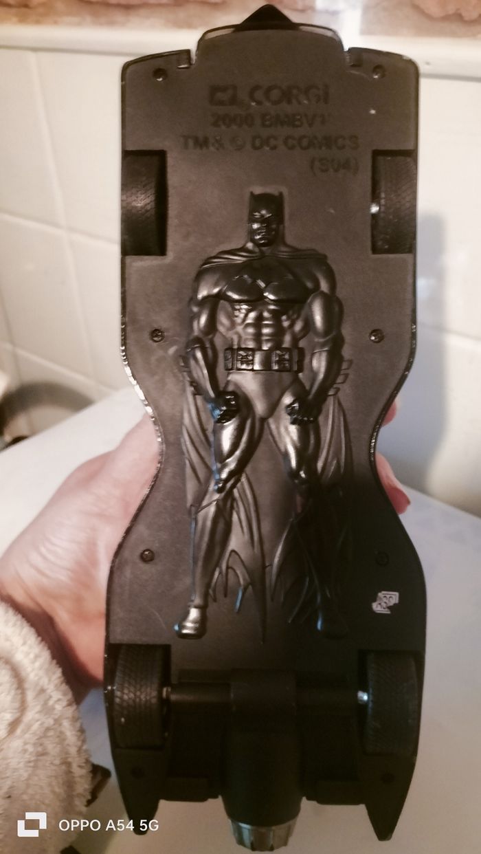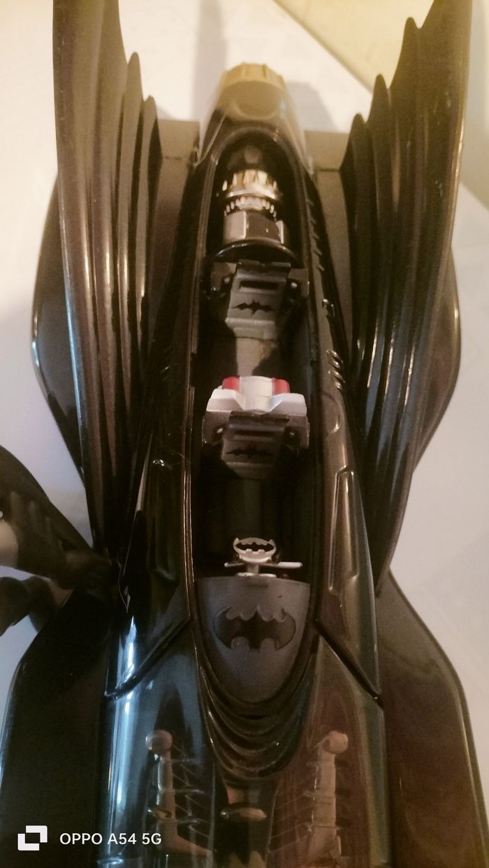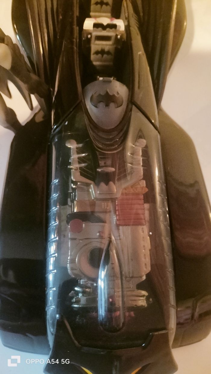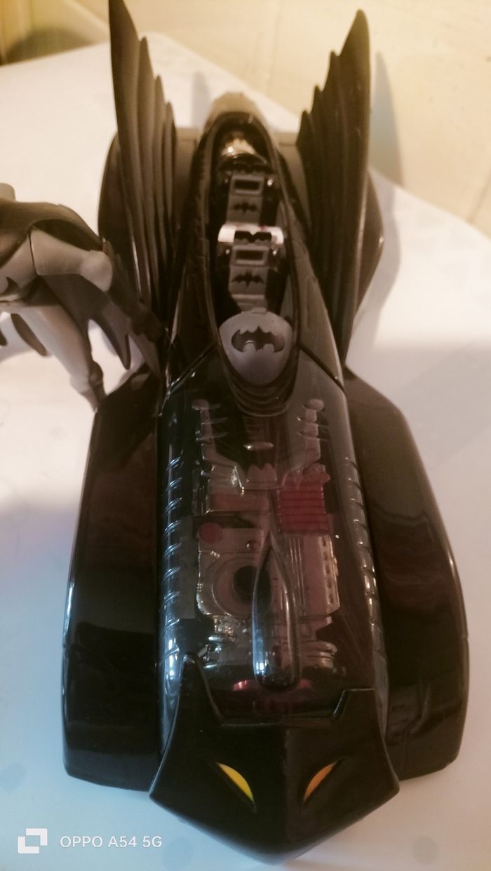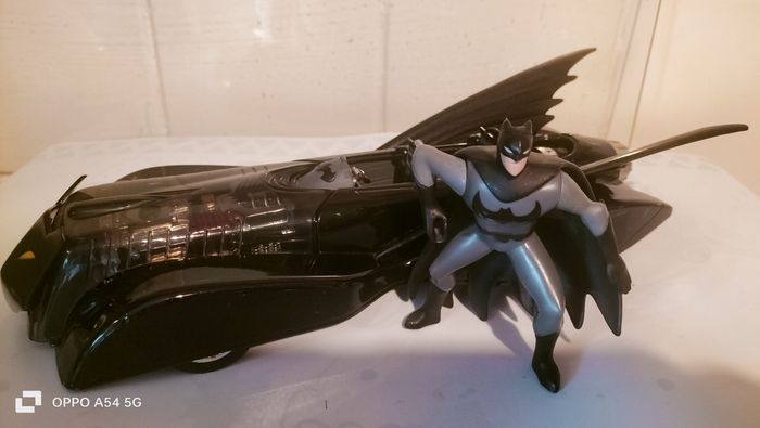 grande voiture Batman avec un personnage - Type de produit : Voiture batman - Gamme / Licence : dc comics - Âge recommandé : De 4/6 ans - Etat : Bon état car il manque une corne sur le motif devant la voiture mais vraiment pas visible ( dernière photo ) - Dimension : 30 cm - Matière : metal pour la voiture , plastique pour les ailes Offre un batman 10€