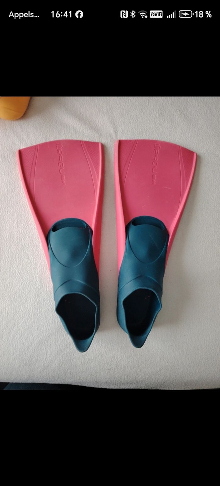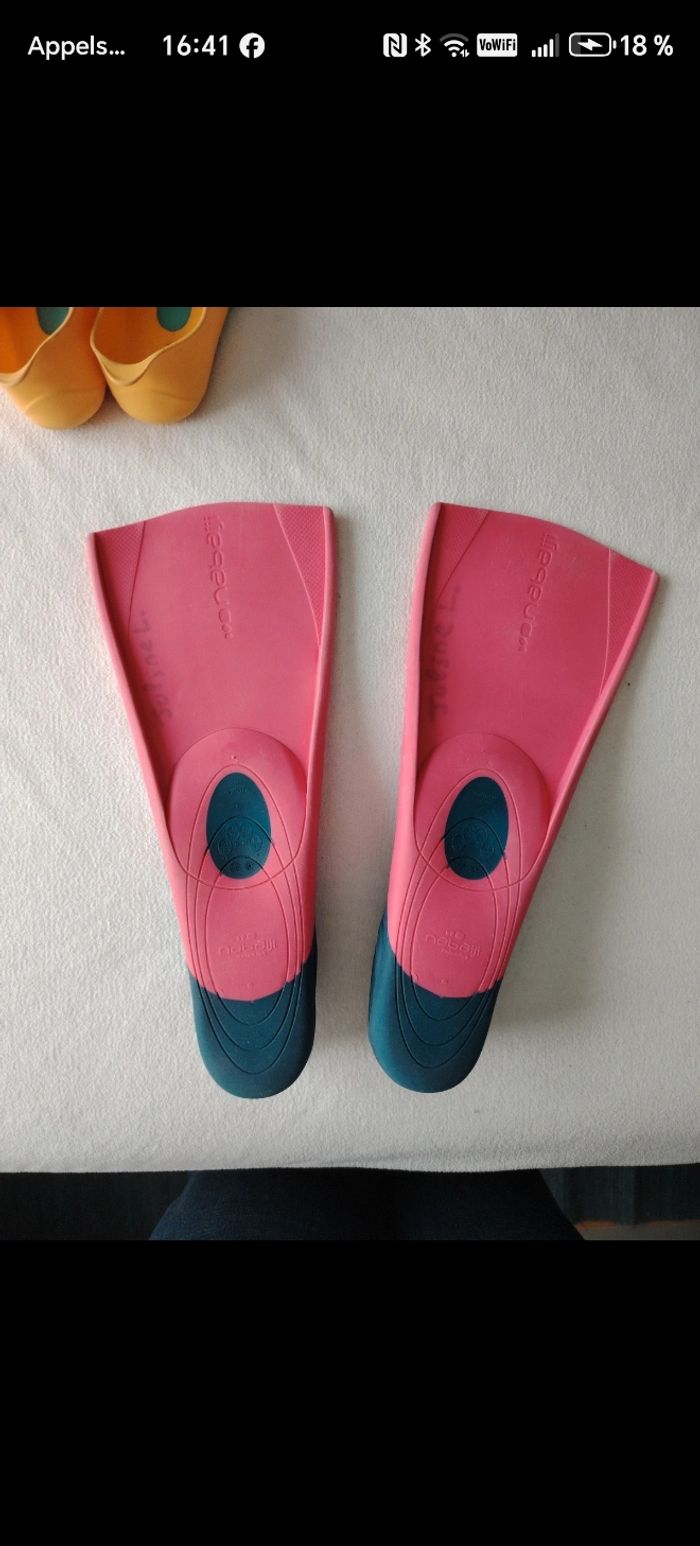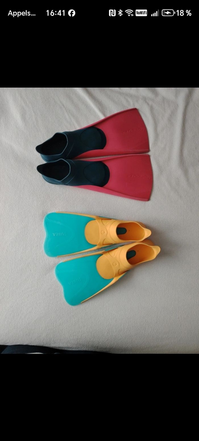 En lot 8€ ou à l'unité Vends 2 paires de palmes de natation 1 paire 4€ Décathlon subea turquoise et jaune pointure 28/29 en bon état usure habituelle en dessous 1 paire 6€ Décathlon nabajii rose et bleu marine pointure 32/33 en très bon état juste le prénom de ma fille resté légèrement écrit en dessous.