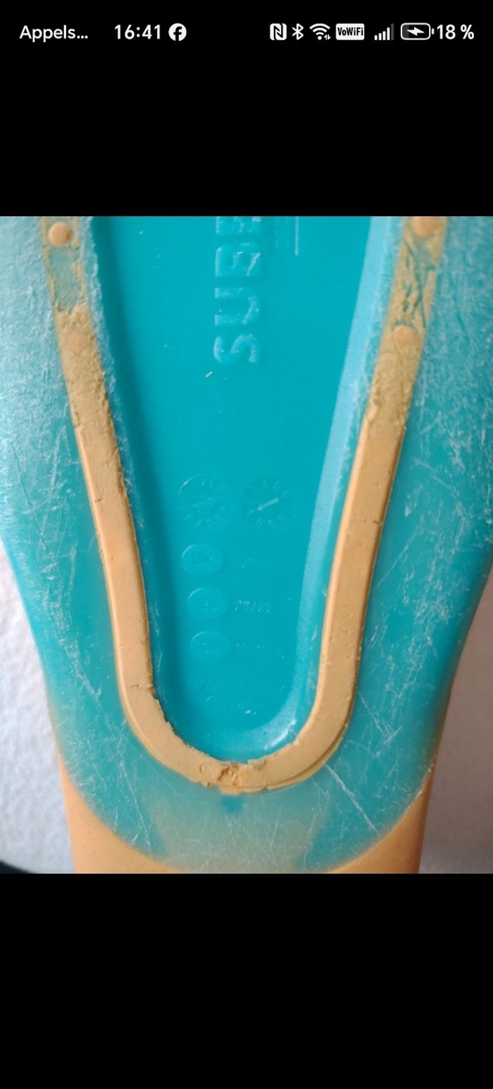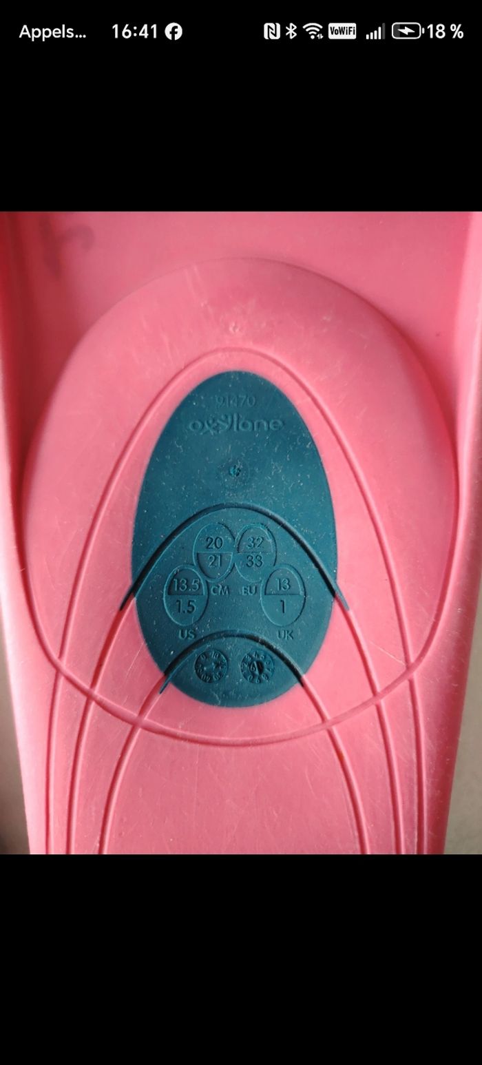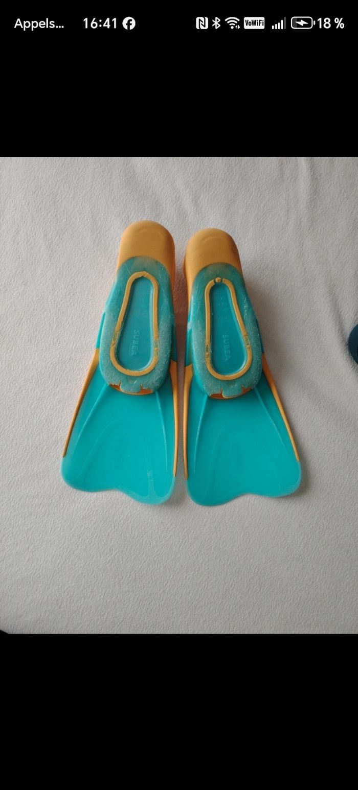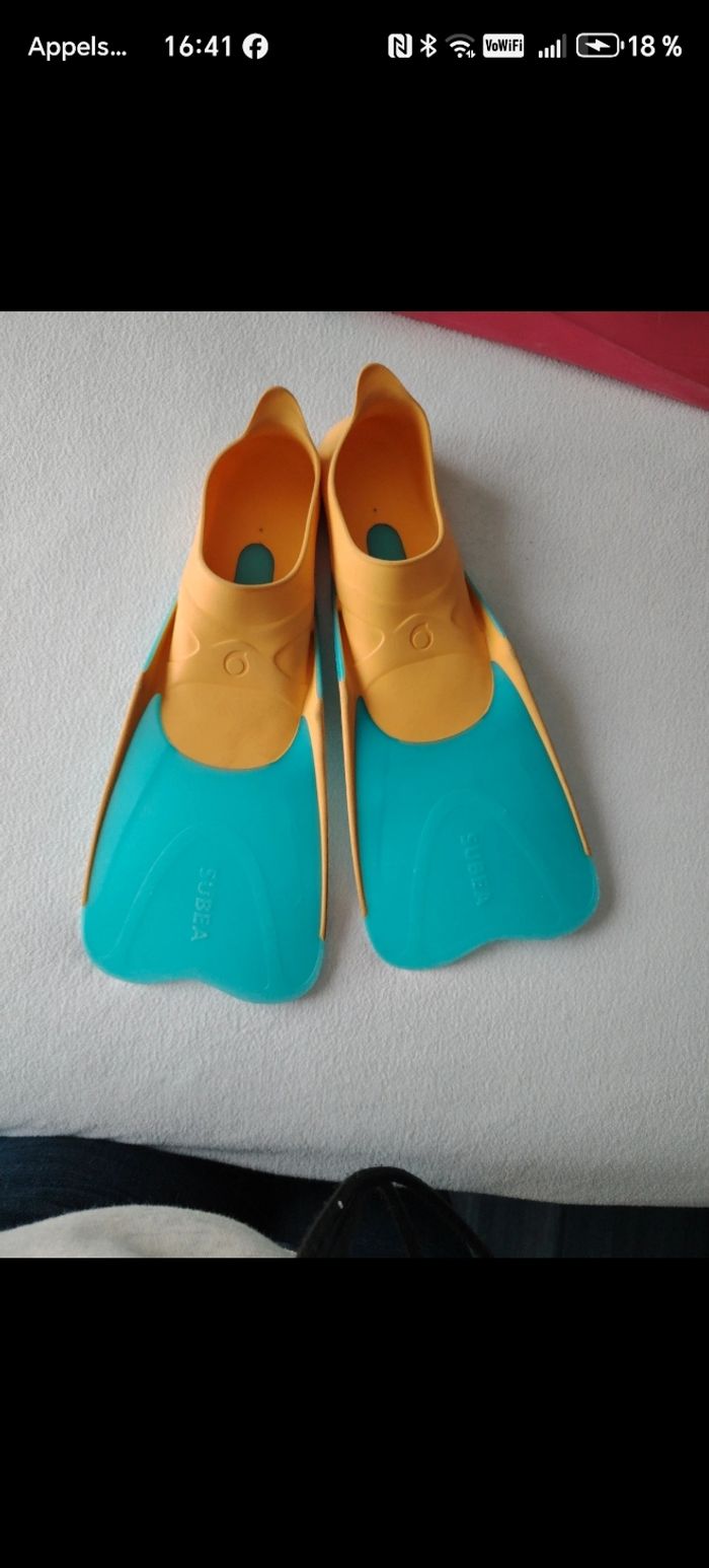 En lot 8€ ou à l'unité Vends 2 paires de palmes de natation 1 paire 4€ Décathlon subea turquoise et jaune pointure 28/29 en bon état usure habituelle en dessous 1 paire 6€ Décathlon nabajii rose et bleu marine pointure 32/33 en très bon état juste le prénom de ma fille resté légèrement écrit en dessous.