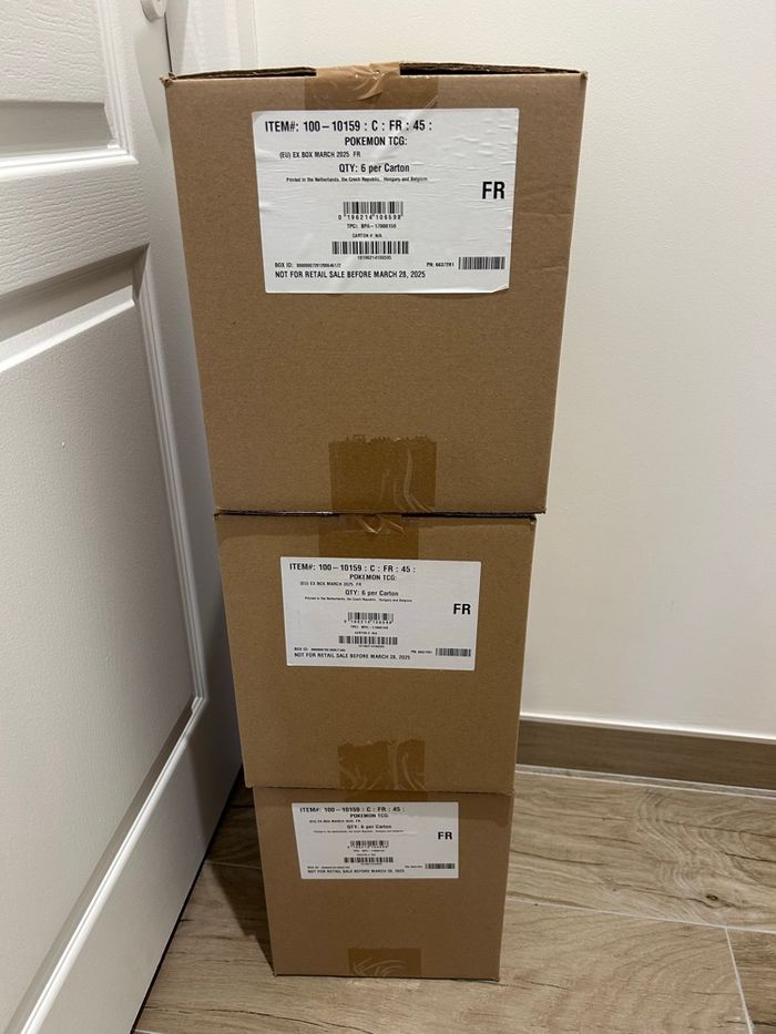 Lot de 3 cases de 6 coffret par cartons. possible de prendre par une. 27€ each. ou 486€ les 3 cases 4 Boosters de 10 cartes du JCC Pokémon (1 * EV02, 1 * EV08, 2 * EV09) 1 Carte Promotionnelle Ultra-Rare représentant Zacian ex de Nabil 2 Cartes Promotionnelles Brillantes de Moumouton & Moumouflon 1 Carte Promo Grand Format Brillante de Zacian ex de Nabil 1 Carte à Code pour le JCC Pokémon Live collection pokémon
