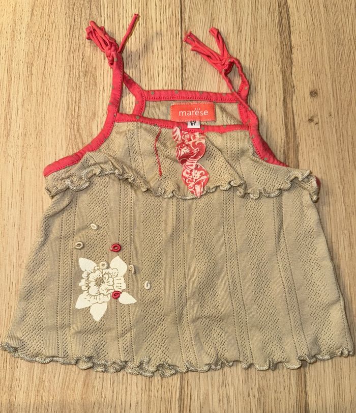 Bonjour Je me sépare de cet ensemble comprenant un top bretelle et pantacourt Marque Marese Coloris taupe et blanc Taille 6 mois