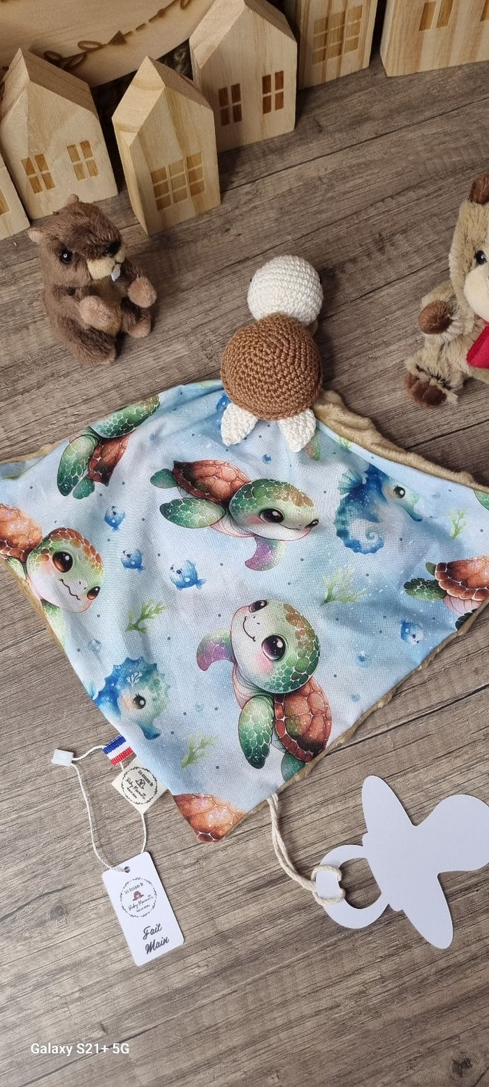 ​🐢 À adopter : Doudou Tortue sensoriel (Coton & Minky) ​Offrez un compagnon de tendresse à votre tout-petit avec cette adorable tortue faite main, conçue pour apaiser et éveiller les sens. ​✨ Les points forts : ​Textures contrastées : Un côté en coton doux avec des motifs délicats et un côté en Minky à pois (reliefs 3D) pour stimuler le toucher de bébé. ​ ​Apaisant : Idéal pour les moments de sieste, les câlins ou comme objet de transition pour la crèche. Personnalisation du prénom de bébé OFFERTE Autres coloris sur commande