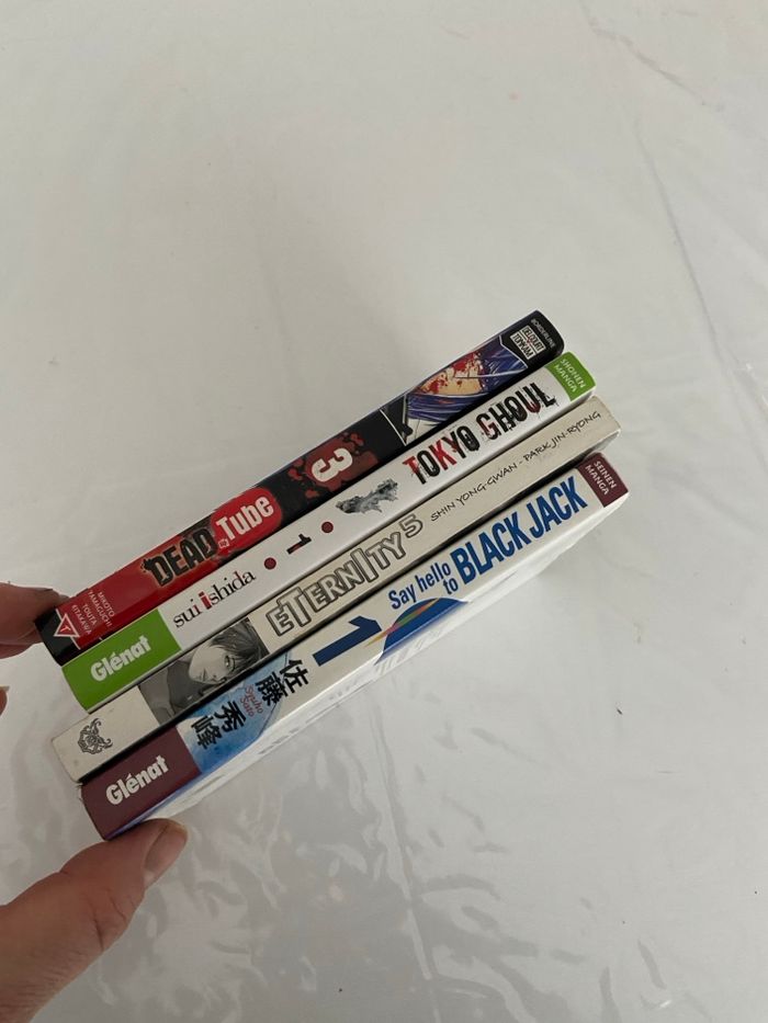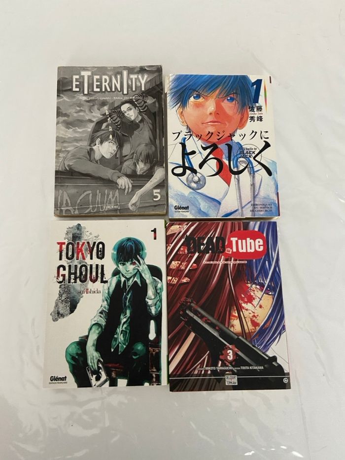Vends un lot de 4 mangas en bon état général. Idéal pour découvrir des séries cultes ou compléter une collection. Contenu du lot : • Tokyo Ghoul (Tome 1) – Sui Ishida • Say Hello to Black Jack (Tome 1) – Syuho Sato • Dead Tube (Tome 3) – Mikoto Yamaguchi / Touta Kitakawa • Eternity (Tome 5) – Shin Yong-Gwan / Park Jin-Ryong Détails importants : • Thèmes : Horreur, Thriller, Psychologique, Médical, Drame. • Âge conseillé : Public averti (16 ans et +). Note : Ces titres contiennent des scènes de violence et des thématiques sombres (notamment Dead Tube et Tokyo Ghoul), ils ne sont pas adaptés aux jeunes enfants. • État : Bon état (tranches légèrement jaunies par le temps, voir photos). • Prix : 15€ le lot (indissociable). Remise en main pro