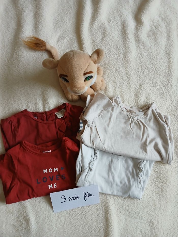 Vend lot de vetement fille bébé 9 mpis en tres bon état Gilet ,une robe ,tee shirts manches longues marques diverses kiabi et autre