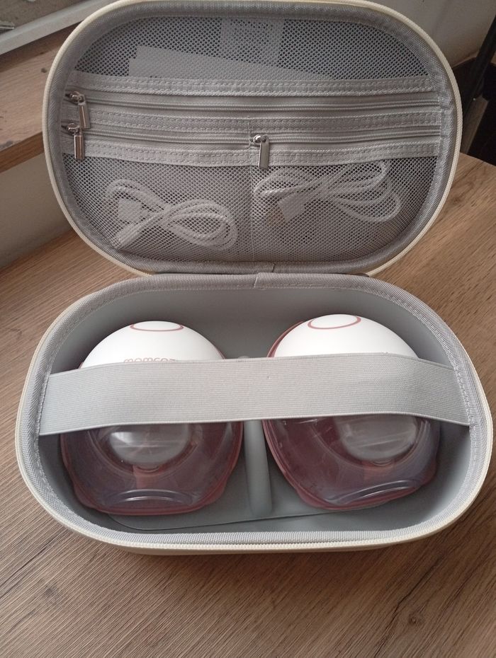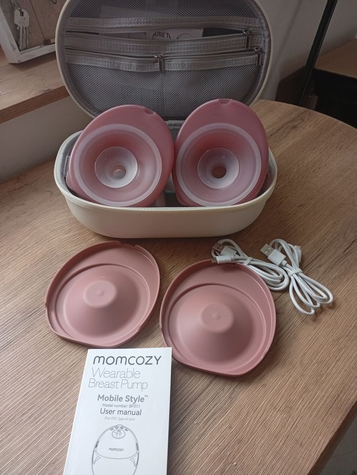 Tire lait momcozy M6 très bon état, très peu utilisé, avec qq téterelles, câbles, boîte de transport et notice Envoi rapide et soigné.