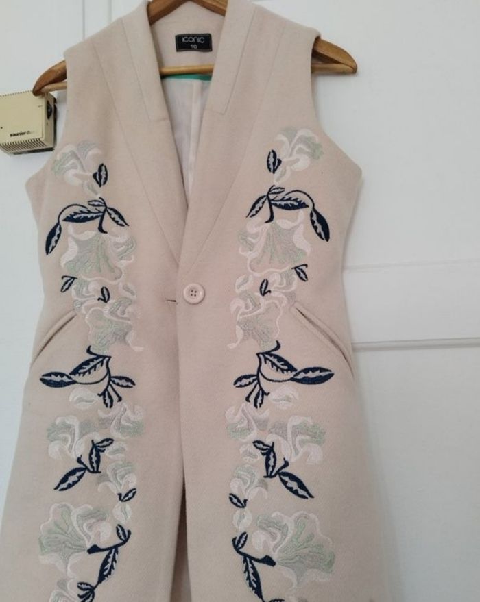 Veste sans manches avec poches et dessins cousus dessus .