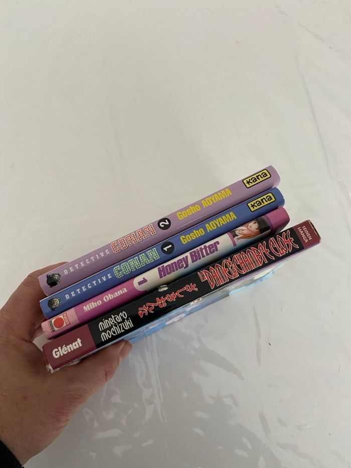 Prix : 15 € Idéal pour les jeunes lecteurs et les amateurs de suspense ! Ce lot comprend des titres cultes parfaits pour découvrir l'univers du manga d'enquête. Détails du lot : • Detective Conan (Tomes 1 & 2) : Le grand classique de Gosho Aoyama. L'histoire d'un détective lycéen transformé en enfant qui continue de résoudre des crimes. • Âge conseillé : Dès 10 ans. • Honey Bitter (Tome 1) : Une histoire centrée sur Shari, une jeune fille travaillant dans une agence de détectives privés grâce à son don particulier. • Âge conseillé : Dès 11-12 ans (Shojo). • La Dame de la Chambre Close : Un "one-shot" (histoire complète) par Minetarō Mochizuki. Un récit de suspense psychologique plus sombre. • Âge conseillé : Pour adolescents (14 ans+) / Seinen. État du lot : • Bon état général. • Les couvertures sont propres et bien conservées. • Tranches légèrement jaunies par le temps (visible sur les photos), mais intérieur impeccable sans pages manquantes ni déchirures. Envoi rapide et soigné ou remise en main propre.