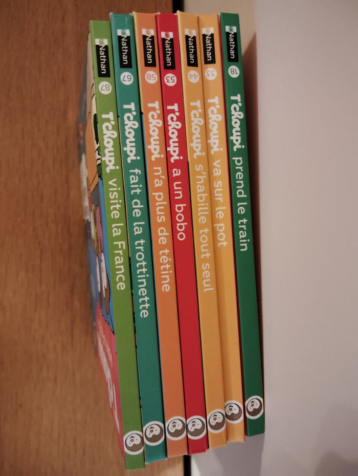 Vends ces 7 livres T'choupi : - T'choupi prend le train - T'choupi va sur le pot - T'choupi s'habille tout seul - T'choupi a un bobo - T'choupi n'a plus de tétine - T'choupi fait de la trottinette - T'choupi visite la France 20€ le lot (soit 3€ le livre environ).
