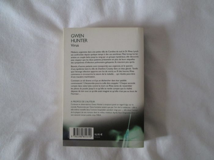 Vends livre Virus de Gwen Hunter. Excellent état. "Médecin urgentiste dans une petite ville de Caroline du sud, le Dr Rhea Lynch est confrontée depuis quelque temps à des cas extrêmes. Mais lorsqu'on lui amène un couple battu jusqu'au sang par un groupe mystérieux, elle découvre avec stupeur que les deux patients présentent en plus de leurs séquelles des symptômes d'infection pulmonaire galopante. Ils meurent peu après. Bientôt, d'autres patients sont transportés aux urgences, et le spectre d'une épidémie tient la ville de Dawkins County dans un étau glacial. Tandis que l'étrange infection apporte son lot de morts au fil des heures, Rhea commence à circonscrire la nature de la maladie ... qui résulte peut-être d'une macabre machination. Comment un tel drame a-t-il peu se déclencher dans leur paisible communauté ? L'hécatombe pourra-t-elle être stoppée ? Chaque seconde compte dans cette lutte contre la mort où Rhea tente de rassembler les pièces du puzzle. Jusqu'à ce qu'elle se rende compte que la réalité dépasse de loin tout ce qu'elle avait imaginé et qu'elle n'est pas au bout de l'horreur ..." N'hésitez pas à consulter mes autres annonces.