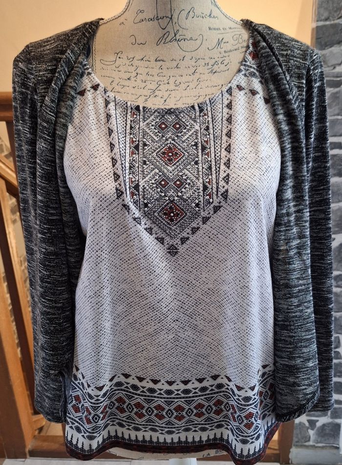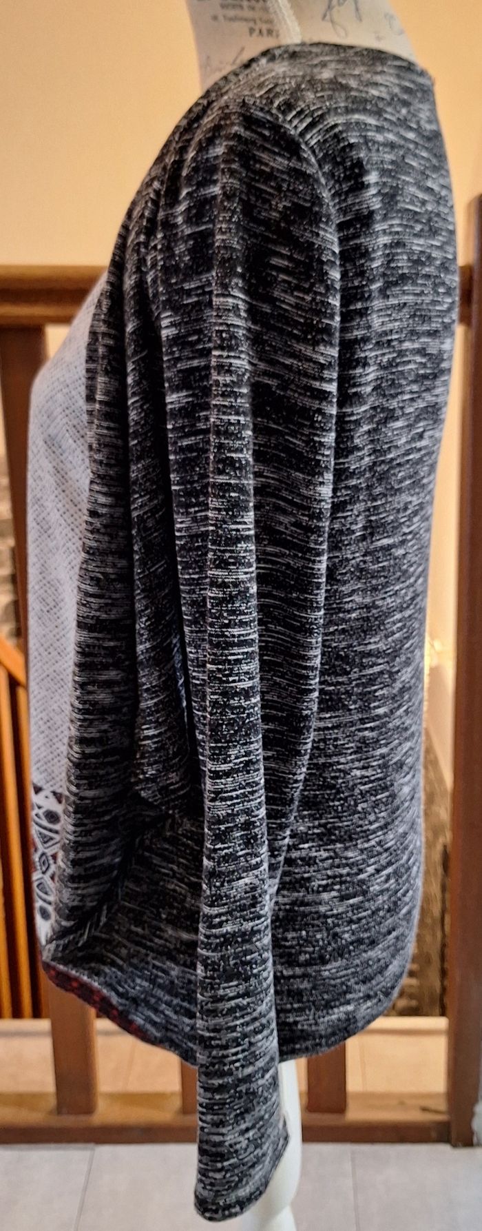 Pull gris chiné, blanc et rouge à strass argentés sous le cou. Il y a des pans devant qui font un effet de superposition. L'étiquette matière/taille a été coupée car ça grattait.