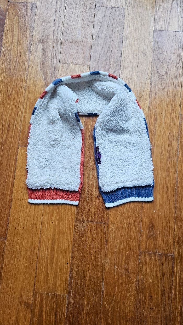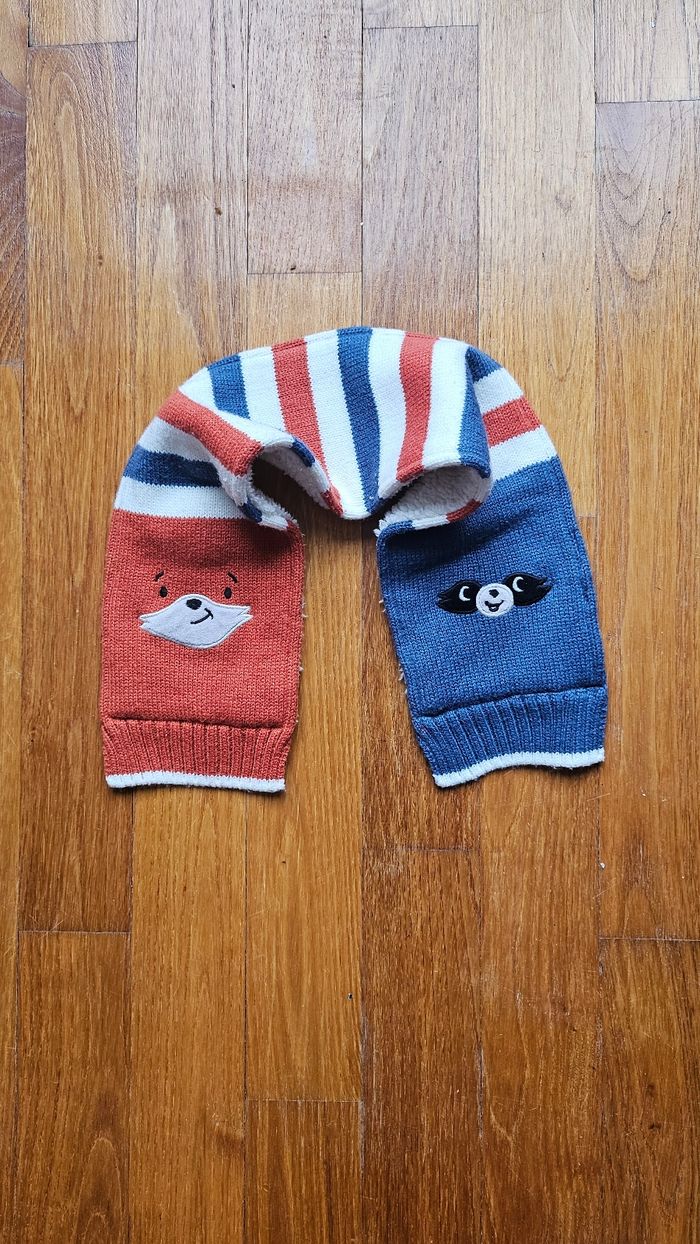 Echarpe en maille avec doublure en polaire. Passant à l'intérieur pour assembler l'écharpe, assurer la sécurité et garder l'enfant au chaud sans faire de nœud. Jamais portée. Taille unique
