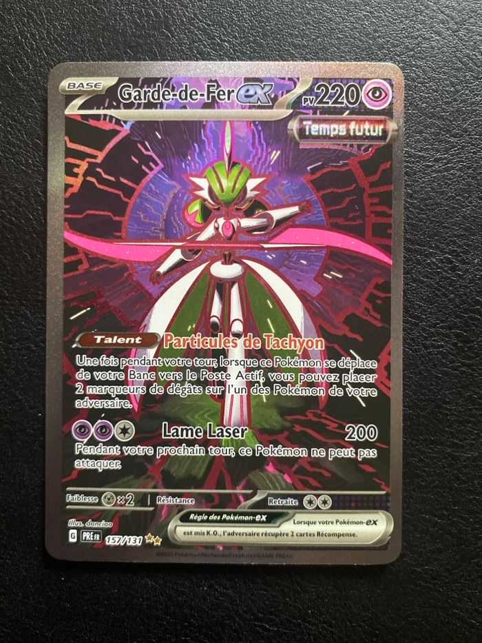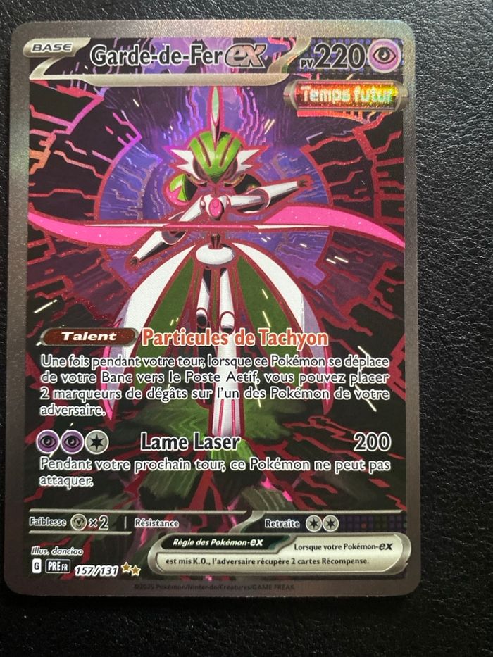 carte Garde-de-Fer ex 157/131 – Alternative – EV8.5 Évolutions Prismatiques (FR). Extension : Évolutions Prismatiques (EV8.5) Pokémon : Iron Valiant Numéro : 157/131 (Secret Rare – numérotation au-delà du set) Rareté : Illustration Rare / Alternative Art