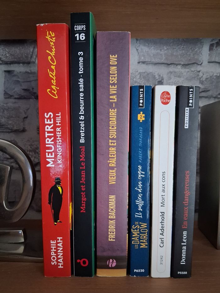 Réduction possible de 30% avec code réduction, soit 28 € le lor. ✏️ Les Dames de Marlow enquêtent Il suffira d’un cygne Edition Points Prix éditeur : 8.95 € Cosy Mystery ✏️ Meurtres à Kingfisher Hills Une nouvelle enquête d'Hercule Poirot Sophie Hannah Edition du masque Prix éditeur : 20.90 € ✏️ Mort aux cons Carl Aderhold Edition Le livre de poche Prix éditeur : 6,95 € Bon état Bretzel et Beurre salé 3 ✏️ L'habit ne fait pas le moine Margot et Jean Le Moal Edition Ookilus Police agrandie : Corps 16 Prix éditeur : 25,50€ Cosy Mystery ✏️ Vieux, râleur et suicidaire Fredrik Backman Edition grand format : Presses de la Cité Prix éditeur : 23 € Littérature Suédoise Note Babelio : 4,10 sur 5 Livre adapté au cinéma sous le titre "Le pire voisin au monde" avec Tom Hanks. ✏️ En eaux dangereuses Donna Leon Edition Points Très bon état Prix éditeur : 8,20 € Bien qu’en très bon état, il s’agit de livres d’occasion qui peuvent présenter des traces sur la couverture ou les coins. N’hésitez pas si vous souhaitez des photos supplémentaires. Livraison acceptée ou remise en main propre possible sur Paris, Bibliothèque François Mitterrand, Gare de Lyon, La Défense, Etampes