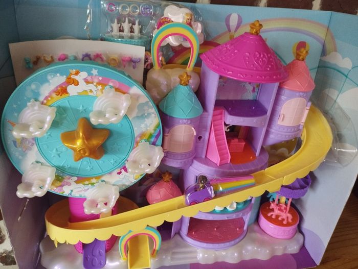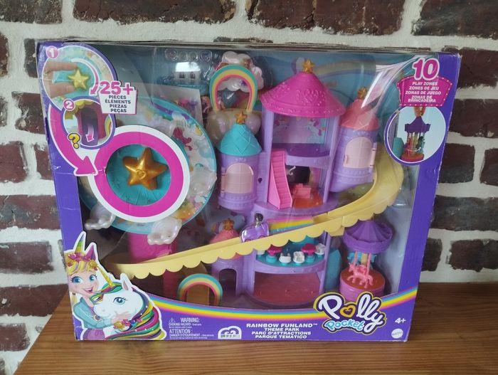 Coffret parc d'attractions Polly Pocket comme neuf, avec tous ses accessoires (il y z bien 2 capes bleues, 1 est manquante sur les photos. Il manque juste 1 anneau rond et 1 étoile, remplacés par 2 ronds pour le jeu d'adresse, voir photos) Avec sa boîte d'origine mais un peu abîmée, voir dernières photos
