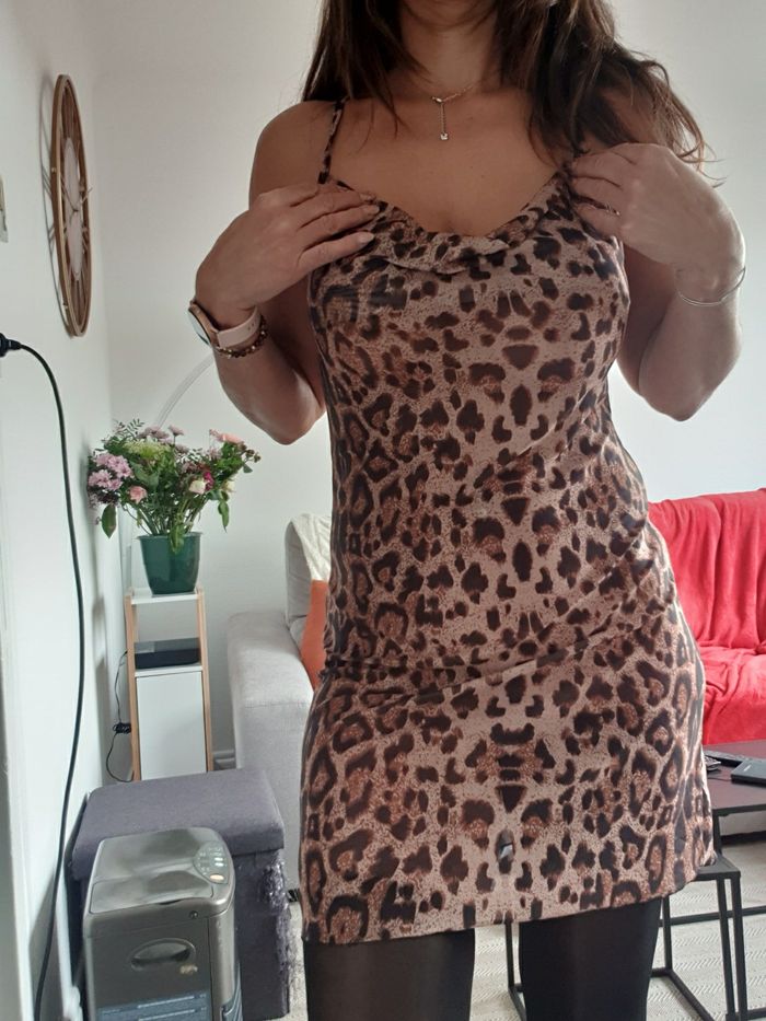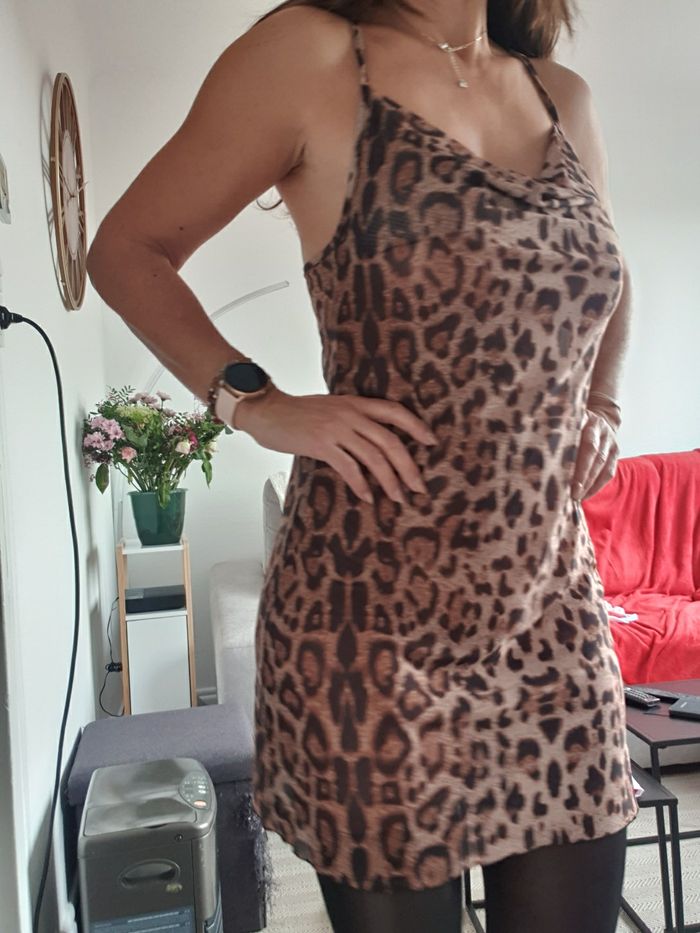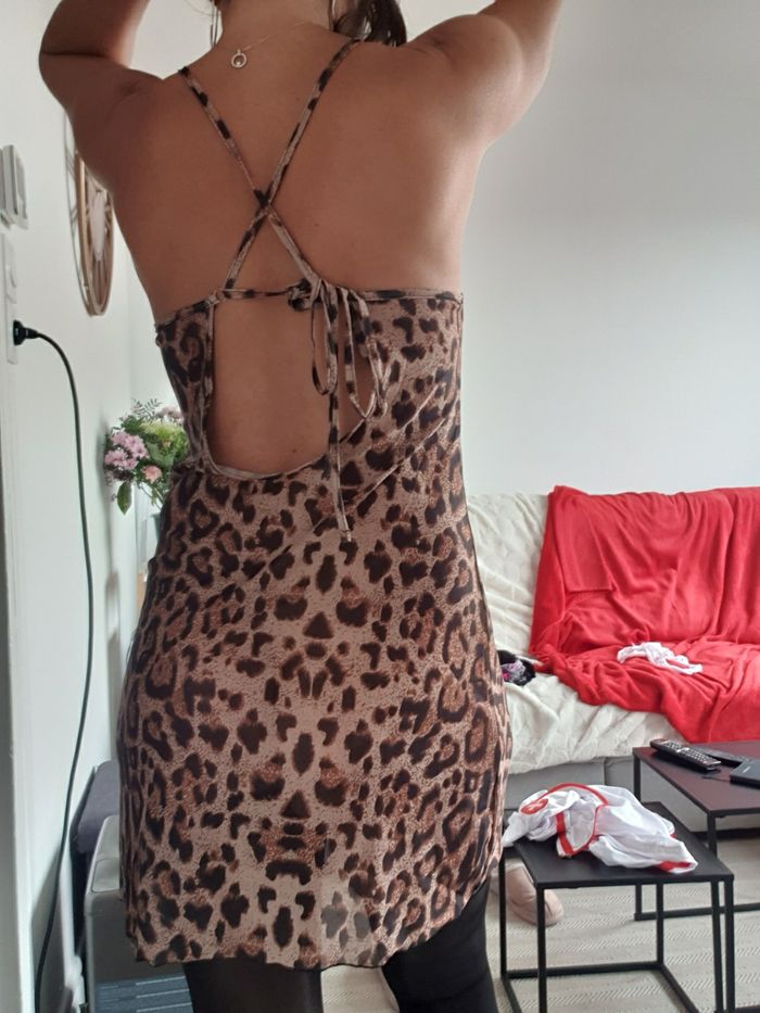 Petite robe léopard bretelles croisées dans le dos, dos ouvert. Je mesure 1,67m pour 65kg environ et 90D de poitrine. Peut se porter en petite robe où petite nuisette