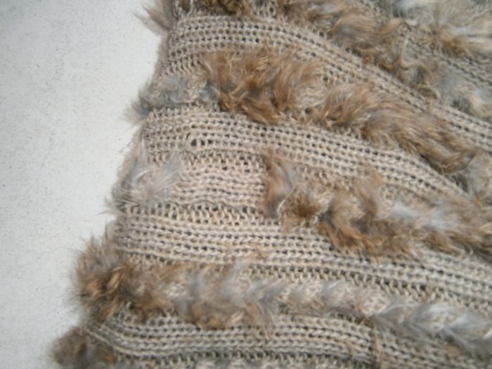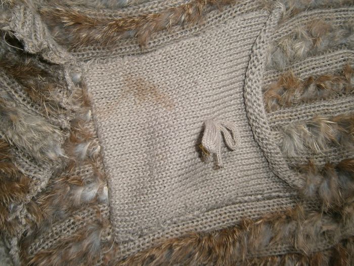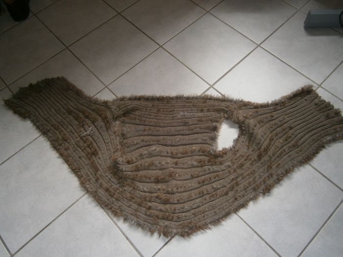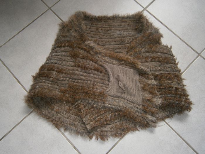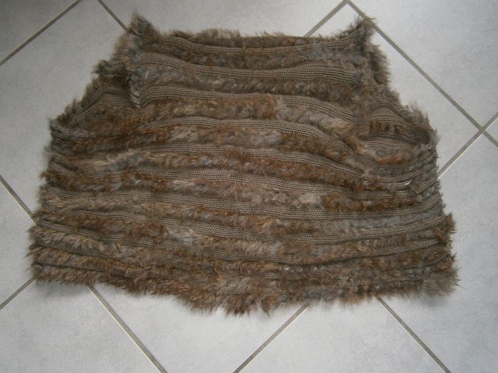 Gilet sans manches. Couleur marron. En laine acrylique. Morceaux de peaux de lapin véritable cousus en ligne. 2 poches en laine devant dont celle de gauche a une tâche (photo). Il manque un morceau (environ 4 cm) sur le côté droit (photo). Taille unique.