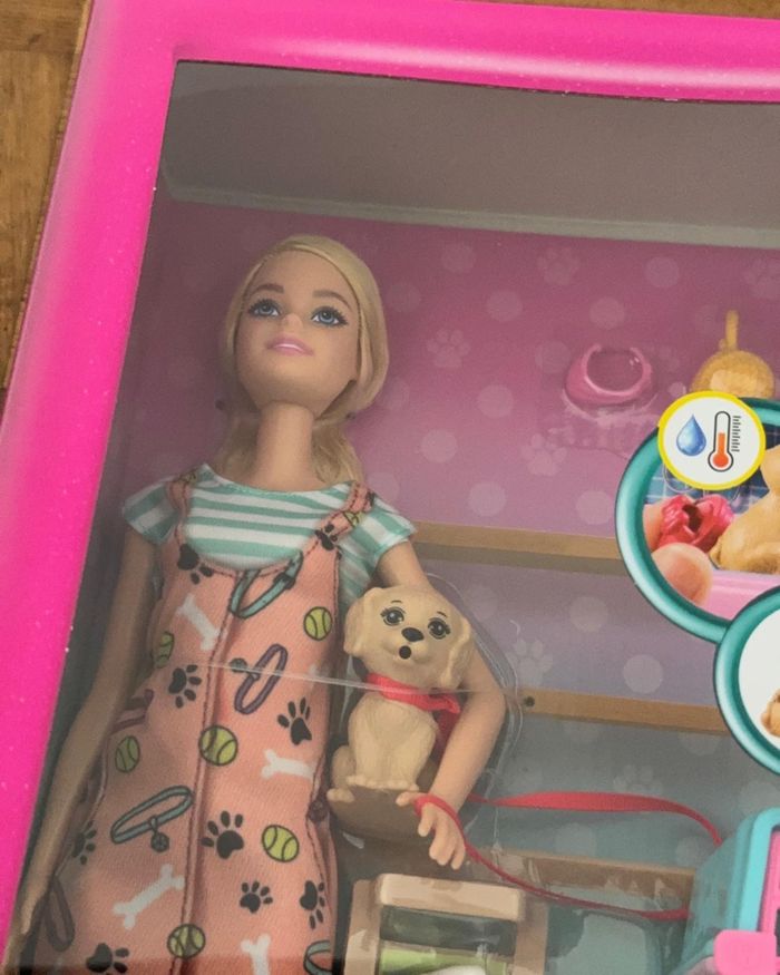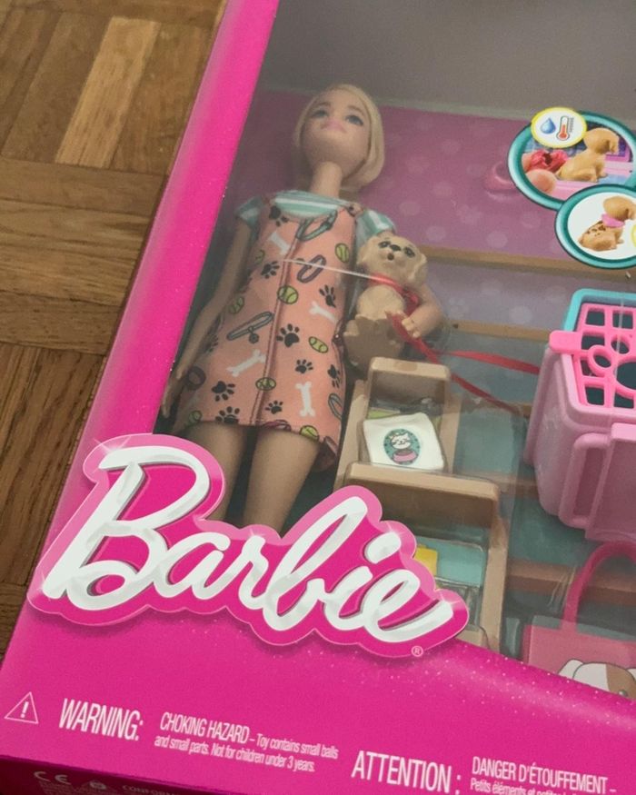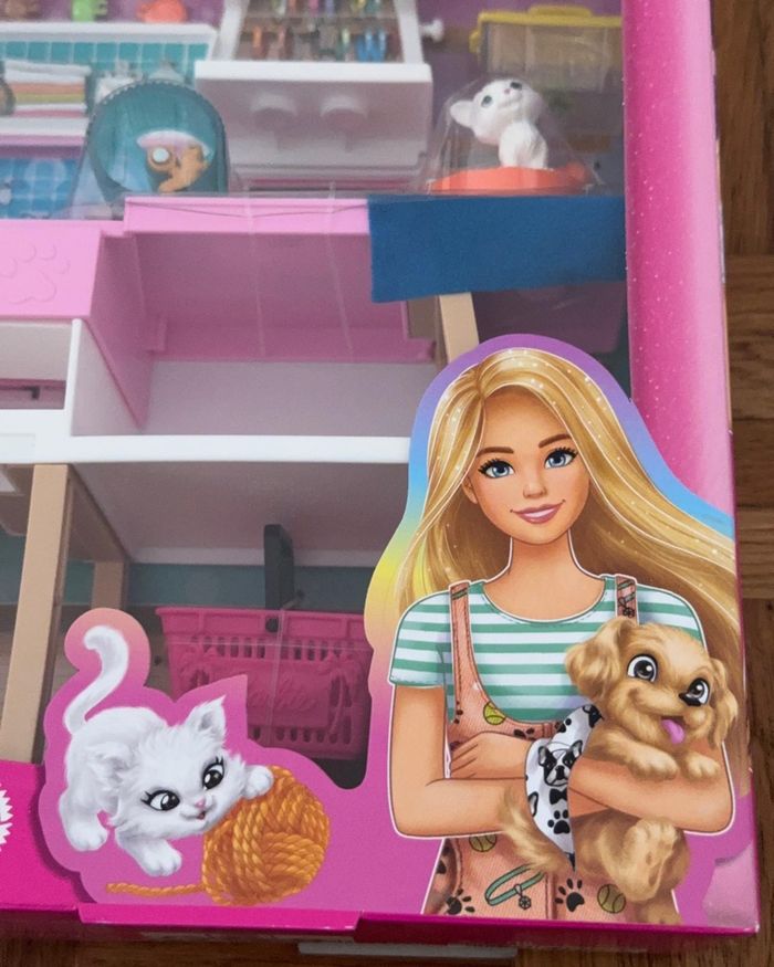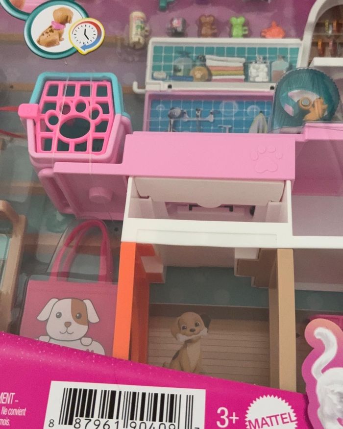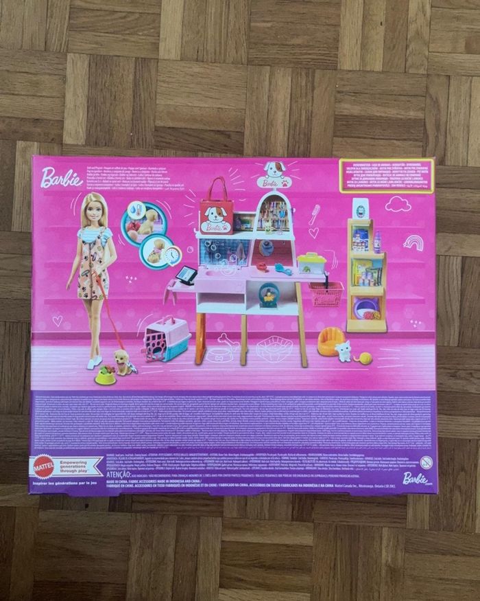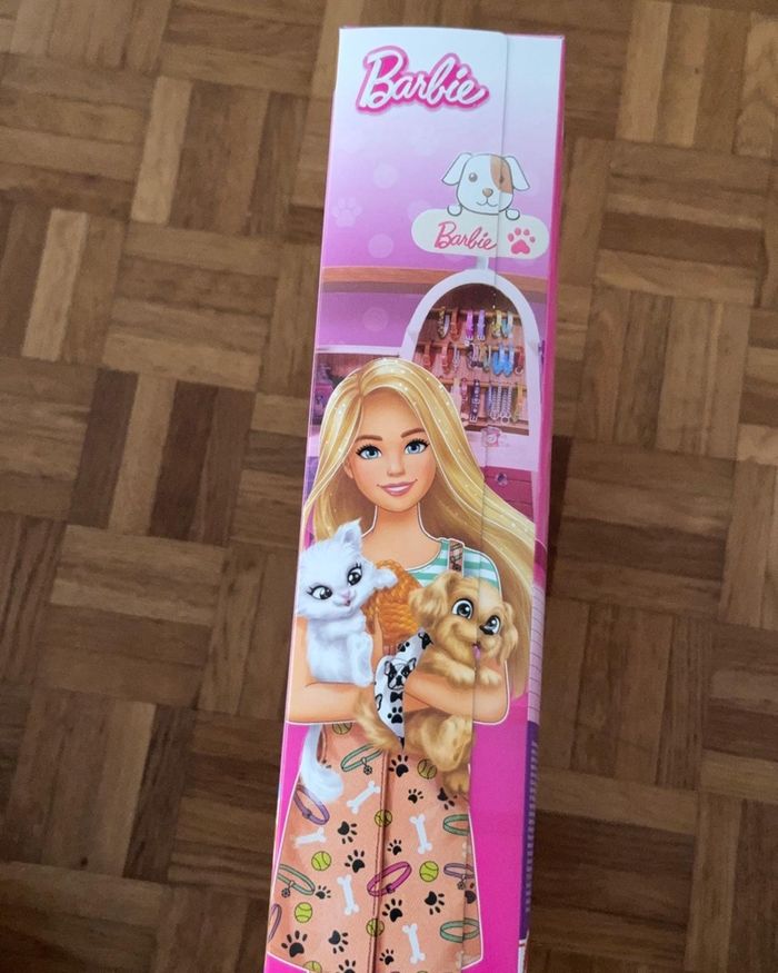 Coffret animalerie Barbie neuf Bienvenue à l'animalerie Barbie, avec 4 animaux, un poste de toilettage, une caisse, des étagères et plus de 20 pièces sur le même thème ! Jamais ouvert