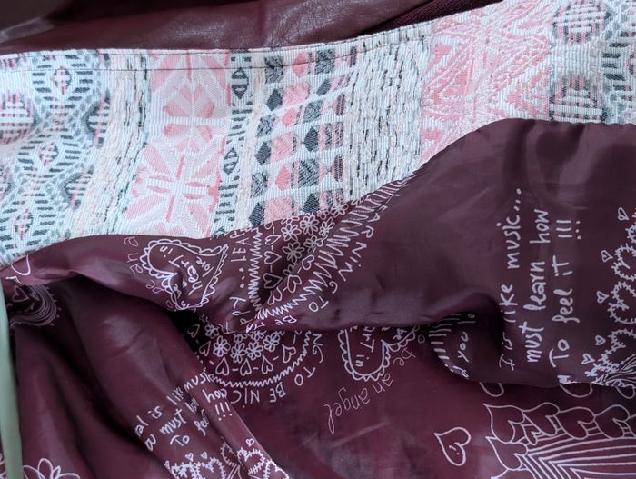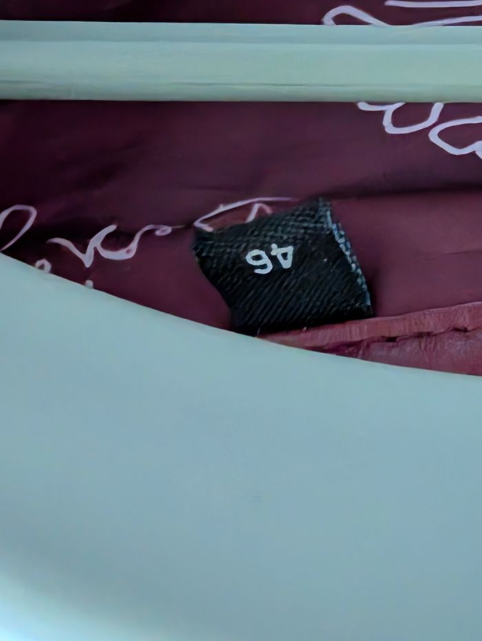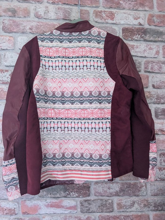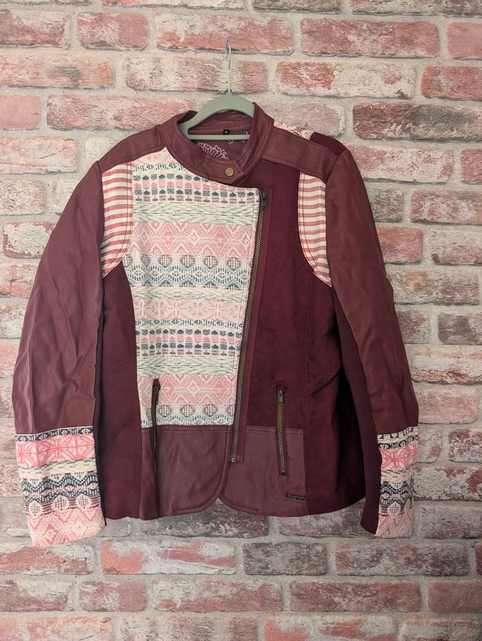 Veste mi-saison en simili cuir et tissus fermé avec fermeture éclair. Très bon état, veste doublée Taille 46 2 poches latérales fermées par zip Mesure d'aisselle à aisselle 54cm Mesure épaules à épaules 42cm Longueur de la veste 65cm