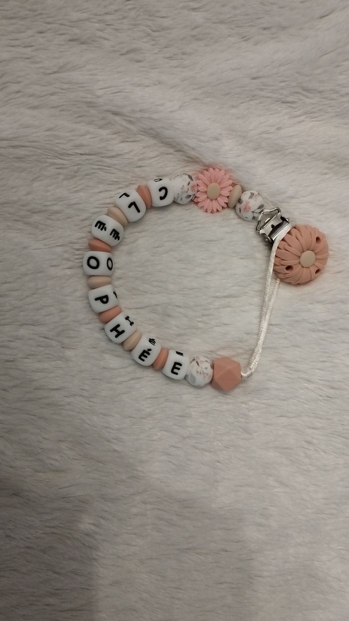 Anciennement les créa d'Aurora ... ✨ Attache-tétine personnalisée en perles de silicone ✨ Entièrement faite main, sécurisée et personnalisable sur commande : choisissez le prénom, les couleurs, le style (simple, décoratif, ou premium avec petites figurines). 🍼 Idéal comme cadeau de naissance, baby shower ou pour un petit bout qui commence à perdre sa tétine partout ! ✔️ Caractéristiques : Perles en silicone alimentaire (sans BPA, PVC, phtalates, ni cadmium) Clip solide et sécurisé Cordon résistant Plusieurs styles disponibles : simple, personnalisé, ou premium (avec fleurs, ours, motifs…) Longueur respectant la norme (pas plus de 22 cm hors clip) 🎁 Personnalisation : Prénom au choix Couleurs au choix Possibilité d’ajouter fleurs, animaux, motifs, perles marbrées, bois… 👉 Création sur commande – réalisation rapide !