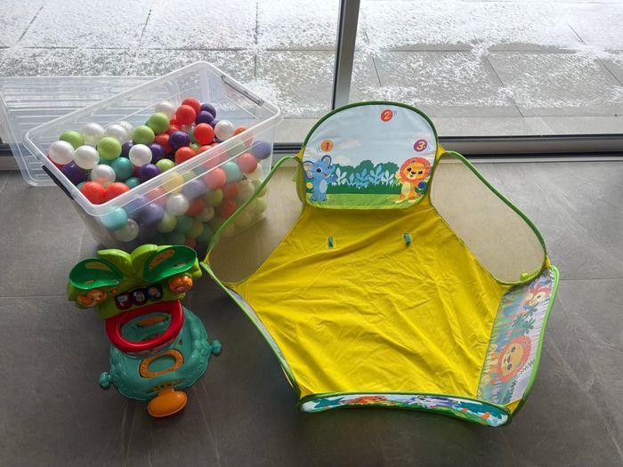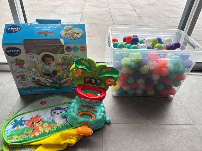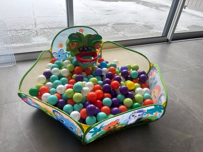 VTech Ma Piscine à balles interactive avec 30 balles + LUDI Carton de 250 balles multicolores souples en plastique anti-écrasement. A partir de 6 mois. Balles à lancer, faire rouler et pour piscine à balles. Diamètre : 6 cm - réf. 90006 Ma Piscine à balles interactive de VTech est une piscine à balles interactive pour apprendre à compter en s’amusant ! Bébé découvre un grand parc à balles joliment illustré pour apprendre en s'amusant. Il lance les balles dans le panier de basket électronique, elles sont comptées et redescendent en musique. Trop rigolo ! Bébé éjecte les balles en appuyant sur la pédale orange. En appuyant sur les deux boutons latéraux, il peut aussi actionner 2 animaux, comme dans un flipper, pour faire glisser les balles le long des toboggans. 3 boutons lumineux pour découvrir les premiers chiffres, les couleurs et inciter Bébé à marquer des paniers. 2 modes de jeu : Chiffres et Animaux. Taille de l'aire de jeu : 100 x 100 x 22,5 cm avec 30 balles multicolores incluses. Piscine légère et pliable pour un rangement facile. 5 chansons et 15 mélodies. Réglage du volume sonore et arrêt automatique. Ce jouet fonctionne avec 3 piles AAA LR03.