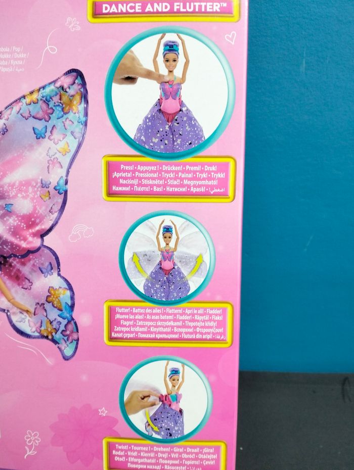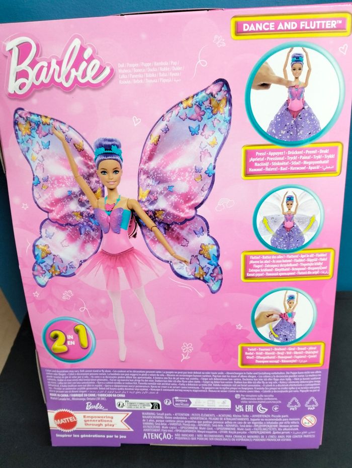 Barbie danseuse a papillon Boite neuve jamais ouverte Les enfants vont adorer inventer des histoires fantastiques de haut vol avec cette poupée Barbie De Danseuse à Papillon et sa transformation 2 en 1 ! Passez de danseuse à papillon en appuyant sur le bouton sur le corsage de la poupée. La jupe violette s’ouvre pour révéler des ailes de papillon géantes et une jupe en tulle rose. Quelle beauté ! Il suffit d’appuyer sur les ailes pour les refermer. Ensuite, appuyez sur le bouton pour réactiver la transformation et revivre cet instant magique encore et encore ! La poupée Barbie porte ses cheveux violets dans un chignon haut avec un serre-tête à fleurs. Elle arbore un corsage papillon et des chaussons de danse classique pour jouer à la ballerine ! Avec deux fois plus de possibilités de jeu, la poupée Barbie De Danseuse à Papillon constitue un cadeau enchanteur pour les enfants à partir de 3 ans !