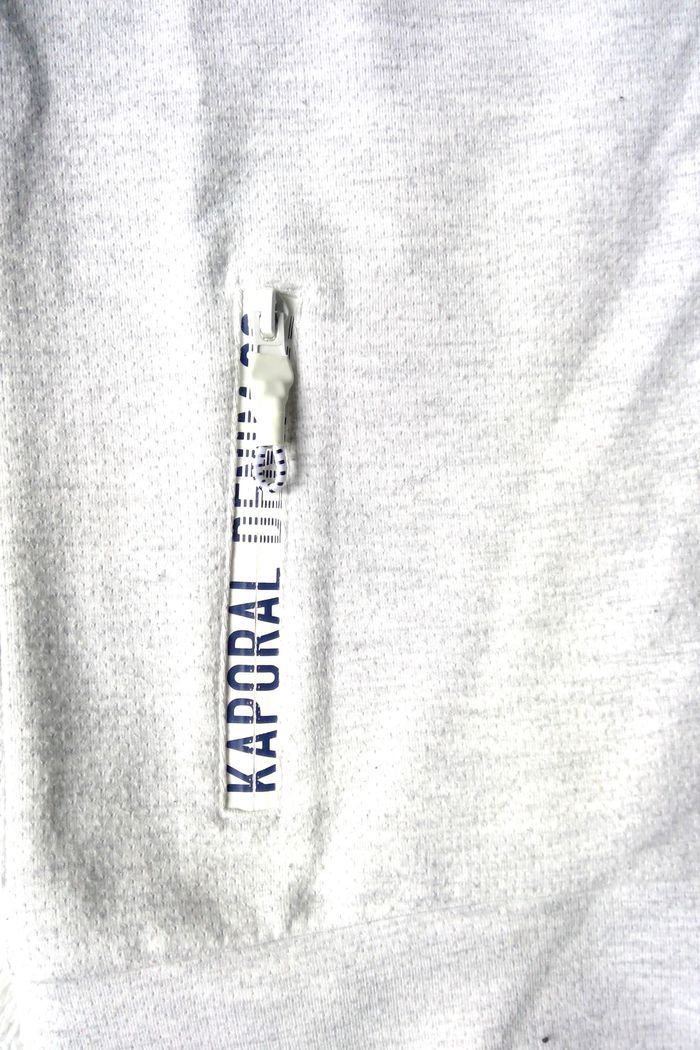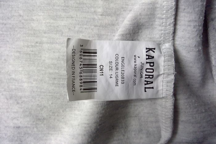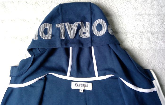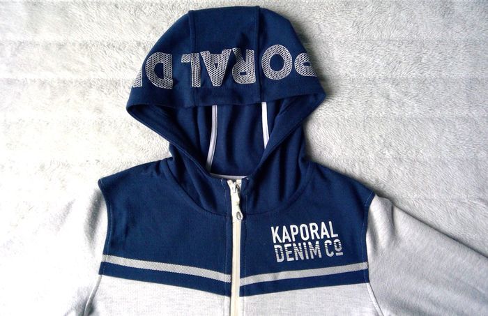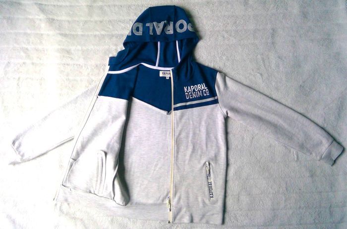 Sweet à capuche KAPORAL Age : 14 ans Couleur : gris et bleu 2 poches latérales avec fermeture éclair Matière : 65% Polyester 32% Viscose 3% élasthanne Envoi ou Remise en mains propres sur Paris 13 ou Pars 5