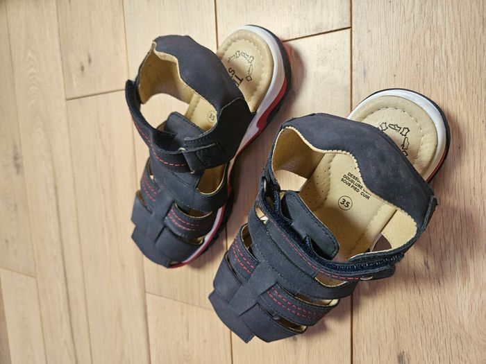 Sandales enfants Produit neuf, jamais porté Taille 35 Dessus cuir, doublure cuir, sous pied cuir Valeur du produit neuf : 40 euros