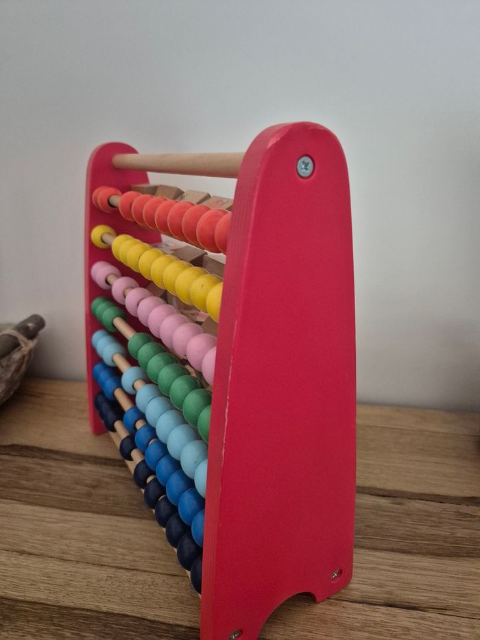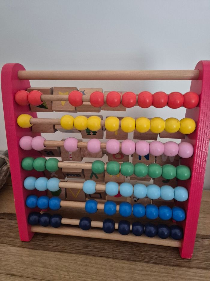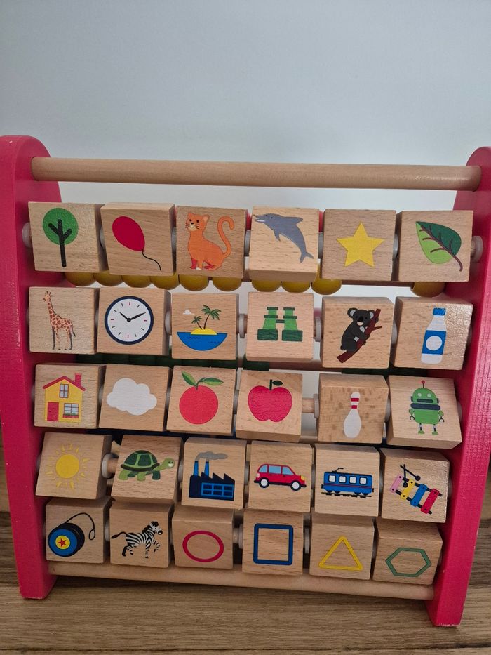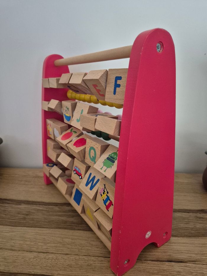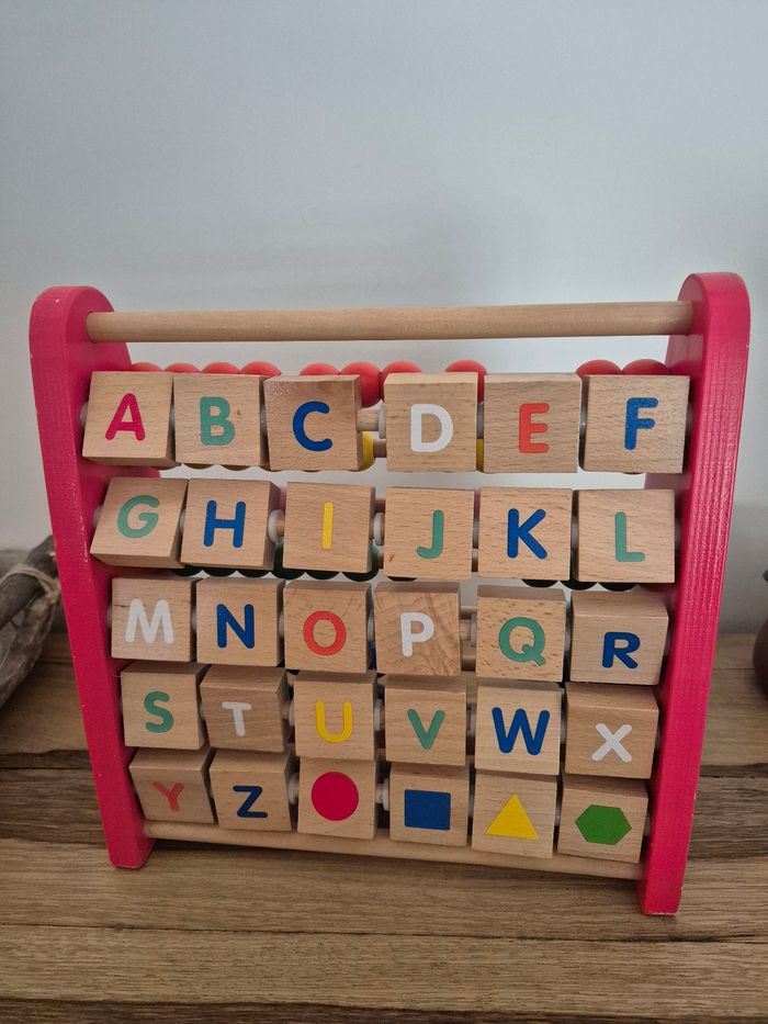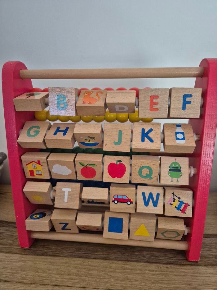 Imagier boulier alphabet 2 en 1 Oxybul Très bon état (quelques légères traces d'usure sur les coins rouges) De 1 à 6 ans D'un côté comme de l'autre, cet imagier boulier 2 en 1 regorge d'apprentissages ! Votre enfant découvre d'abord le boulier classique en faisant coulisser les perles en bois pour développer sa motricité et réviser les couleurs. Les découvertes se poursuivent de l'autre côté avec un alphabet imagier des plus surprenant : pour découvrir l'image et son mot, votre enfant fait pivoter la pièce en bois. Quand il est à l'aise, il revient au boulier pour apprendre à trier et compter. Puis il repasse à l'imagier et apprend à prononcer les lettres ! Vendu neuf sur le site Oxybul au prix de 21,99 euros