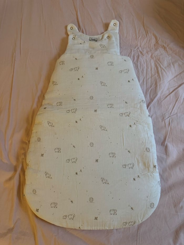 Je vends une magnifique gigoteuse Natalys, taille T1, idéale dès la naissance ainsi qu'une gigoteuse Okaidi. Coloris blanc/écru avec petits motits moutons discrets, mixte. Matière douce et confortable, parfaite pour garder bébé bien au chaud en toute sécurité. V Jamais utilisé V Sans tache ni défaut V Boutons pression aux épaules V Pressions au dos pour faciliter l'installation