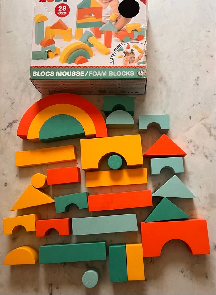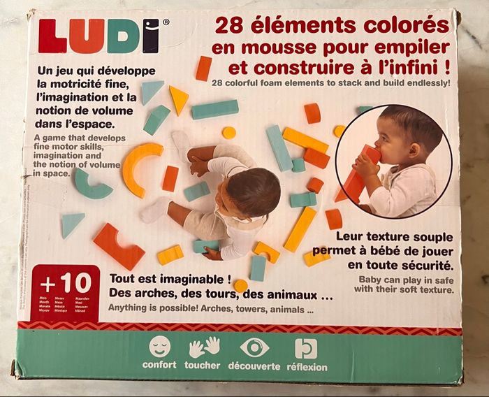28 blocs de construction mousse Ludi Ultra léger Un jeu qui développe la motricité fine, l'imagination et la notion de volume dans l'espace.