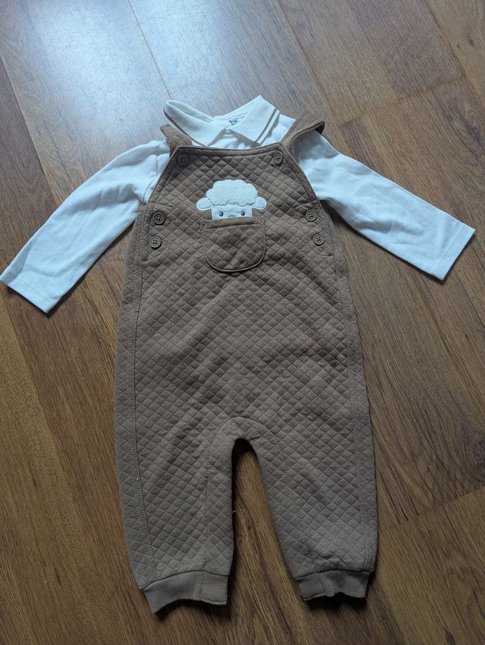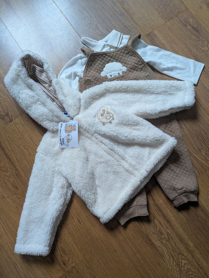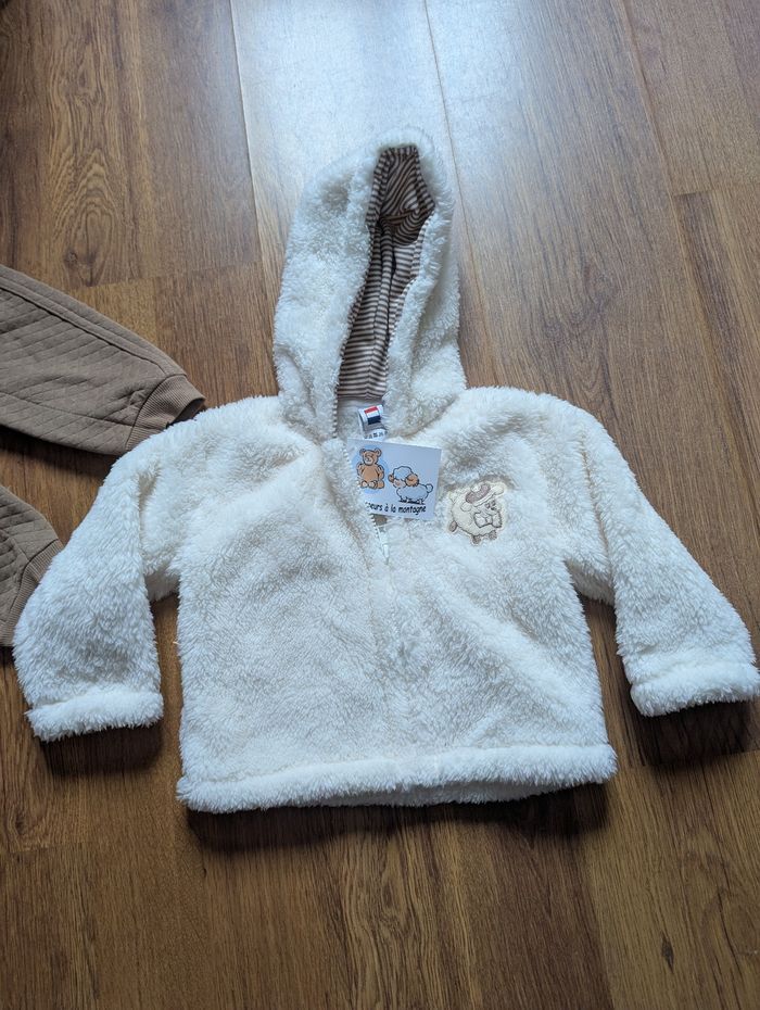 Très bel ensemble tout neuf comprenant : - une salopette molletonnée et boutonnée avec bretelles réglables et beau motif mouton, couleur marron - polo à manches longues, - veste zippée à capuche en sherpa couleur crème
