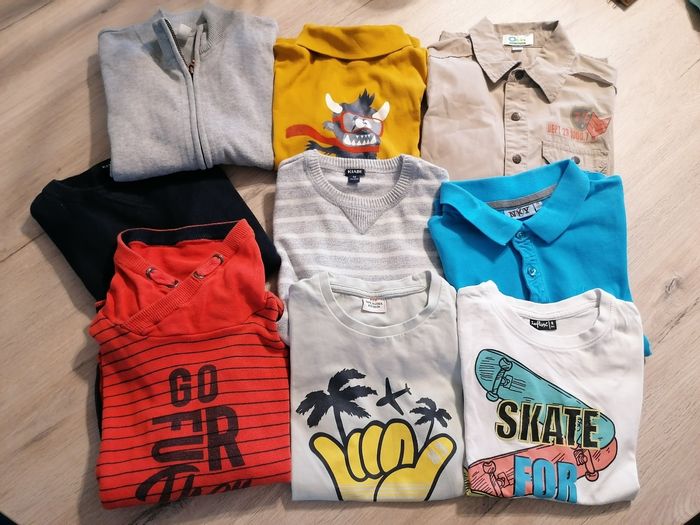 Lot 8 ans garçon en bon état Gilet gris okaidi Pull bleu marine kiabi Pull orange av petit col okaidi Sous pull moutarde kiabi Pull gris rayé blanc kiabi Tee shit TAO Tee shirt influx Polo bleu NKY Chemise manche longue marron clair okaidi Tout en très bon état