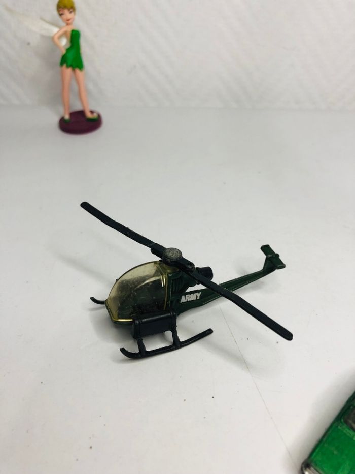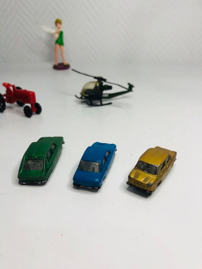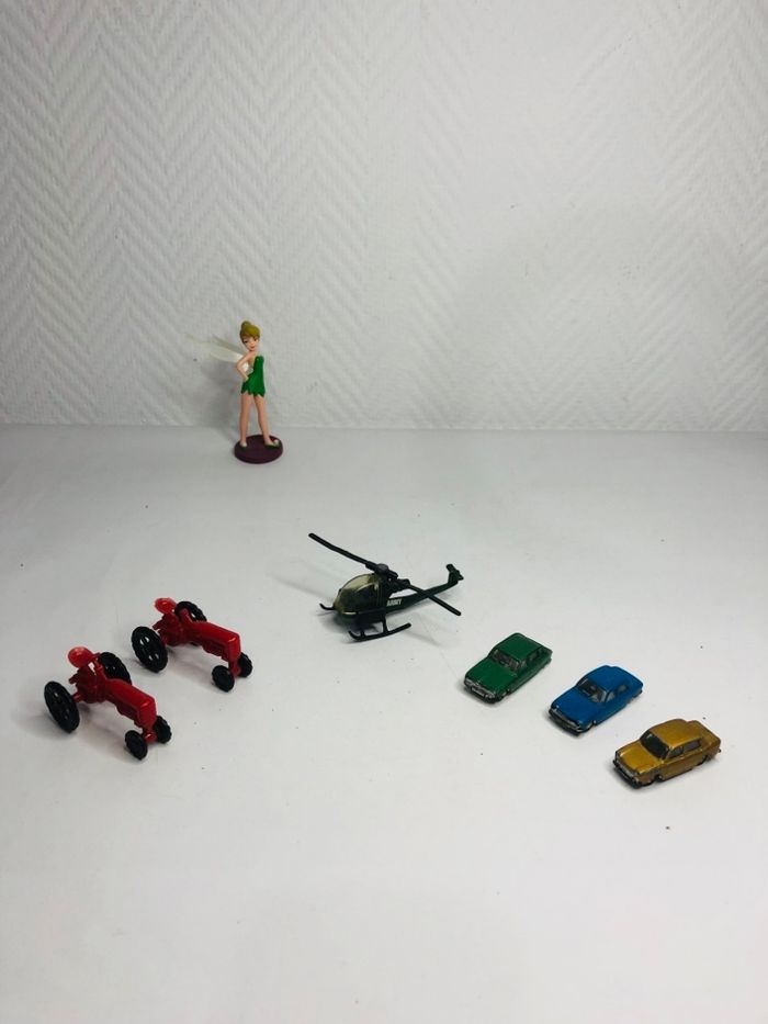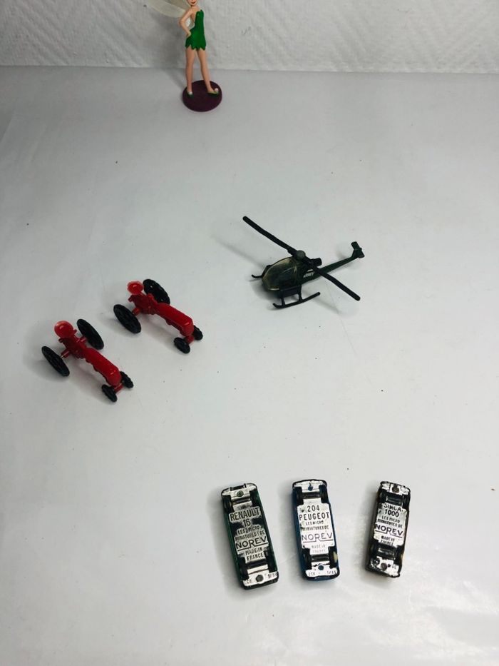 Lot de modèles réduits, comprenant des tracteurs, un hélicoptère et des voitures miniatures. - Type de produits : Tracteurs, hélicoptère, voitures miniatures - Composition du lot : 2 tracteurs rouges, 1 hélicoptère, 3 voitures miniatures En bon état voir photos