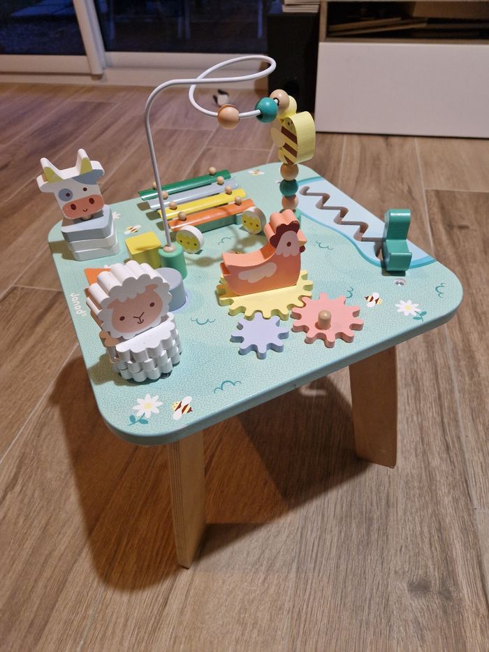 Je vends cette table d'éveil bébé Janod, idéale pour les tout-petits à partir de 12 mois. - Type de produit : Table d'éveil bébé - Marque : Janod - Âge recommandé : 12 mois et + - Matière : Bois - Fonctionnalités : Nombreux éléments interactifs (engrenages, perles, xylophone, etc.) Très bon état N'hésitez pas à me contacter pour plus d'informations !