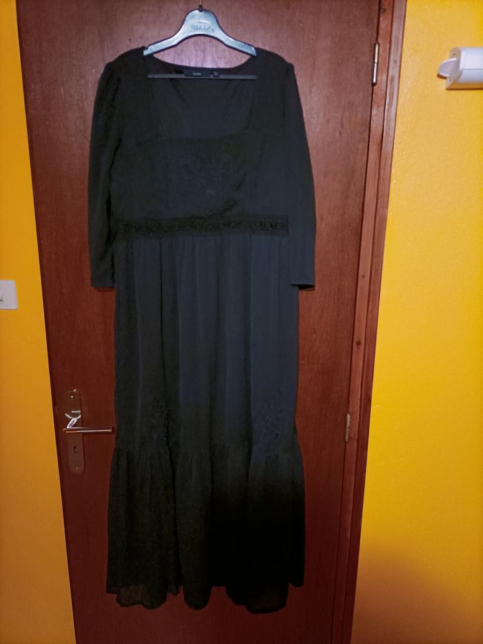 Magnifique longue robe noire avec 3/4 manches, fleurs brodées juste en dessous la poirtine, bande ajourée au-dessus la taille. Portée qu'une fois.