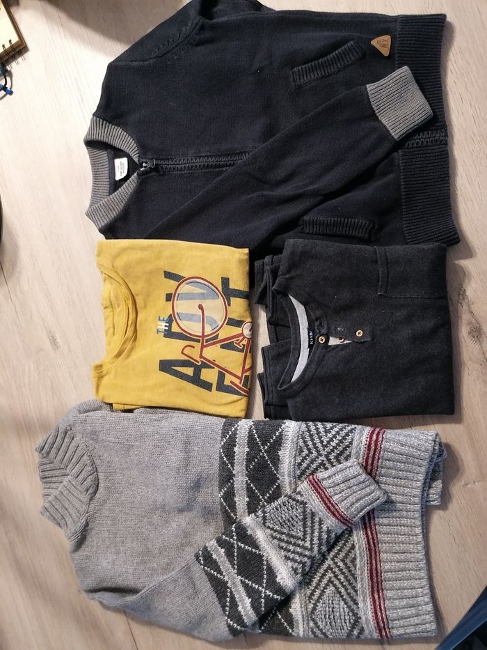 Lot garçon 8 ans en bon état Pull hiver gris okaidi Tee shirt moutarde grandes manches okaidi Pull fin kiabi Gilet épais bleu marine TAO