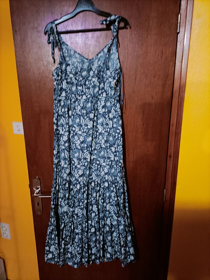 Robe bleue à tendance fleurs, mesure 125cm , taille 40. Portée qu'une fois.