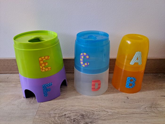 Jeu d'empilage avec 5 modes de jeu pour offrir à bébé de multiples occasions de développer sa motricité et sa créativité. Ses 6 coupes s'empilent pour former une tour de 60cm de haut et y faire dégringoler les 4 balles de couleurs incluses. Les 6 lettres à découvrir et un socle en forme de puzzle à assembler garantiront à bébé encore plus d'amusement et de découvertes. Les 4 balles sont de couleur différente pour aussi développer l'apprentissage de bébé. Dés 6 mois.