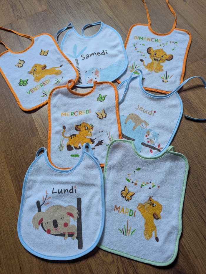 Lot de 7 bavoirs semainier, neufs, mélange roi lion et animaux de la jungle, à Ficelles