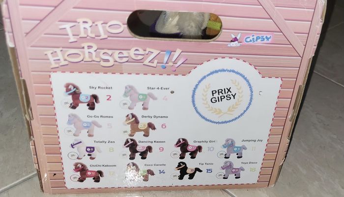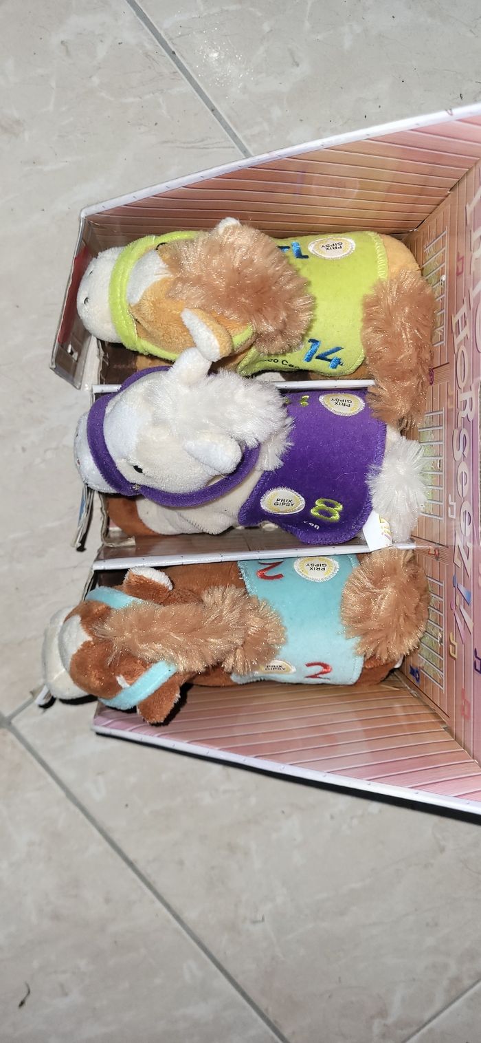 3 poney peluche avec leur étable en carton