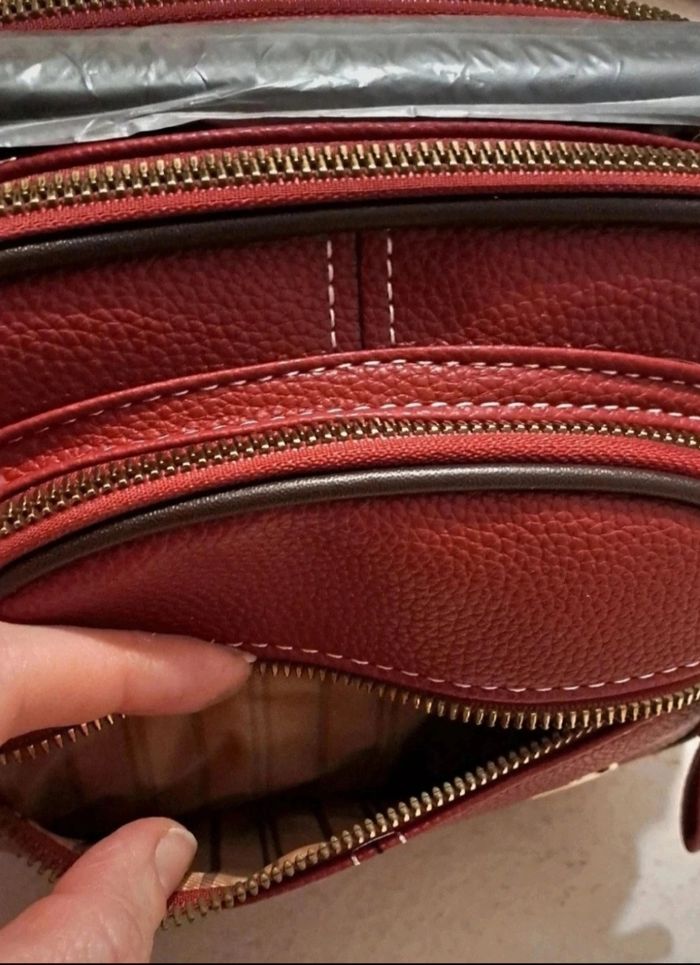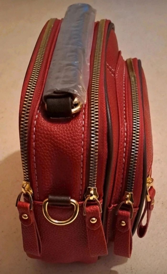 Sac à main en simili cuir de couleur bordeaux, à porter en bandoulière ou à la main, sangle amovible, multifonctionnel, spacieux, grande capacité de rangement, compartimenté, 5 poches zippées, fermetures éclairs dorées, 2 grandes poches, 1 moyenne et 2 petites, doublures en polyester, 22 cm de long, 13 cm de large, 19 cm de haut, hauteur de poignée 7 cm, marque Kismis, état neuf jamais utilisé
