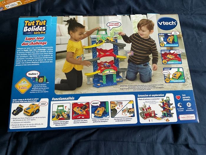 La course palpitante est sur le point de commencer ! Rendez-vous au sommet de la tour ! Votre enfant utilise le lanceur intégré pour faire dévaler la piste à ses bolides, la course s’annonce serrée entre Lenny as du circuit et la voiture de course rivale (non électronique) ! Les Tut Tut Bolides déclenchent des phrases et des sons supplémentaires lorsqu'ils roulent sur le 3 Zones Magiques ! Génial ! Une petite voiture et une voiture de course non électroniques sont également inclus ! Fonctionnalités de ce jouet Tut Tut Bolides Série Pro : Lenny as du circuit : appuyer sur le visage lumineux pour entendre des chansons, des phrases et des sons rigolos. La lumière clignote en rythme avec les sons. Compatible avec les Zones Magiques de la tour duo challenge et les pistes magiques (vendues séparément). Motricité fine : lanceur intégré à lever pour envoyer les bolides dans la course et drapeaux rotatifs à manipuler. 3 niveaux de courses avec carrefours : pour une course pleine de rebondissements et de chocs ! Zones Magiques : les Tut Tut Bolides® réagissent aux Zones Magiques par des phrases supplémentaires, de la musique ou des sons rigolos. Compatibilité : la Super tour duo challenge est compatible avec tous les autres univers de jeu Tut Tut Bolides®. Inclus dans ce circuit voiture : Un bolide : Lenny as du circuit Une voiture de course non électronique 3 chansons et 6 mélodies 3 Zones Magiques + de 70 chansons, mélodies, sons et phrases 1 planche d’autocollants Lanceur de bolide et drapeau rotatif Un podium 30 éléments et 5 vis pour construire la Super tour duo challenge Arrêt automatique pour préserver la durée de vie des piles